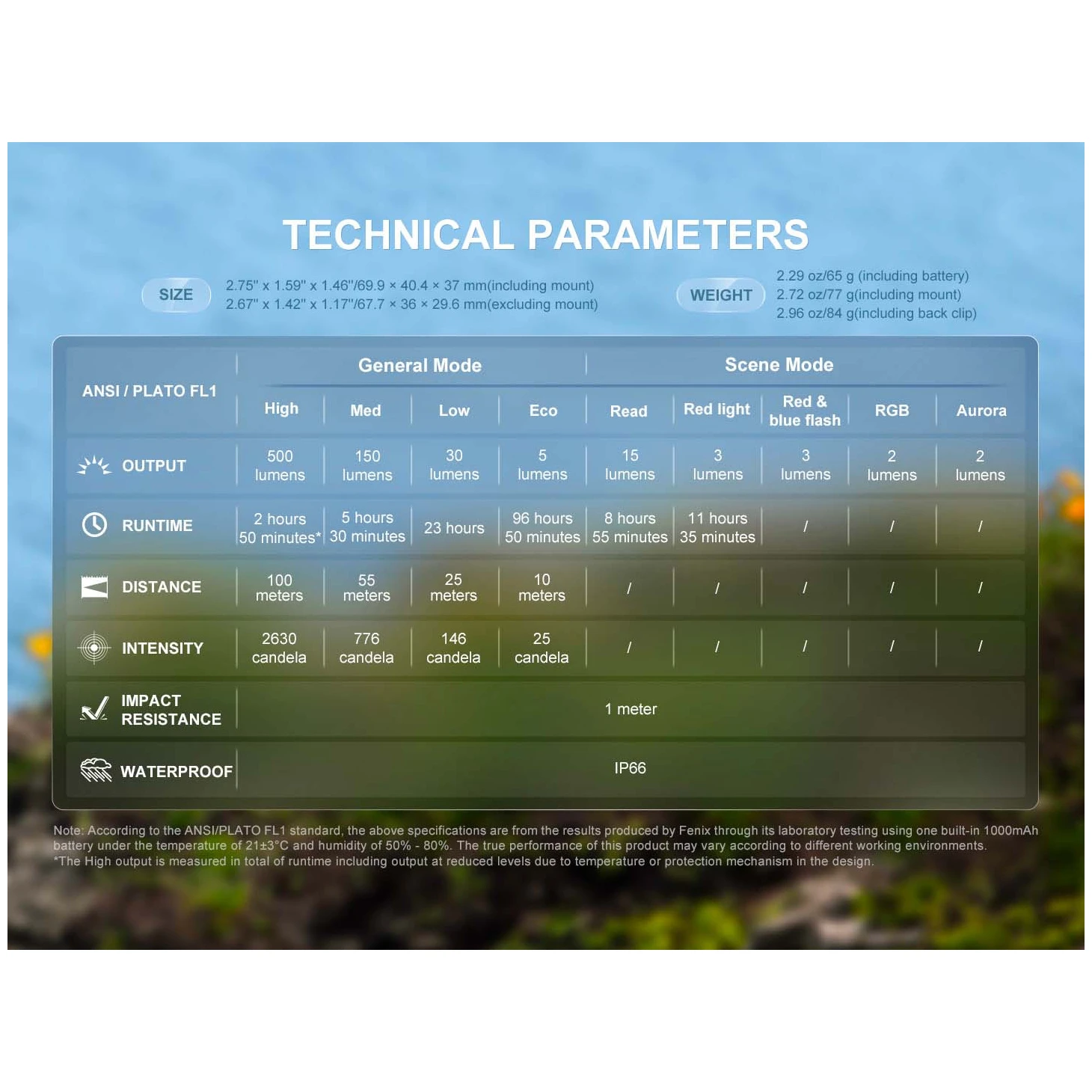 Svi parametri prednjih svjetala (svjetlosni tok, vrijeme rada baterije, vodootpornost, naknadni sjaj i otpornost na udarce) mjere se u skladu sa standardom ANSI/NEMA FL 1-2009.