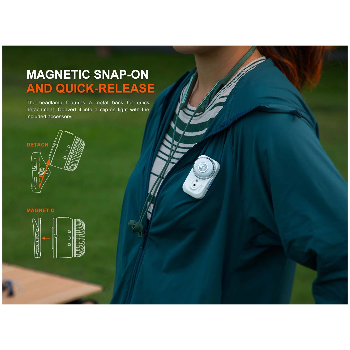 Jedinstveni način pričvršćivanja naglavne svjetiljke u držaču magnetom omogućuje njezino trenutno uklanjanje i korištenje kao ručne svjetiljke. Pomoću isporučenog klipa možete je pričvrstiti na remen ruksaka, na džep ili remen. Zahvaljujući snažnom magnetu možete je pričvrstiti na željeznu površinu kao radno svjetlo, svjetiljku ili je čak možete jednostavno pričvrstiti na odjeću. Nosite je na glavi, u ruci, na prsima – mašti nema granica!