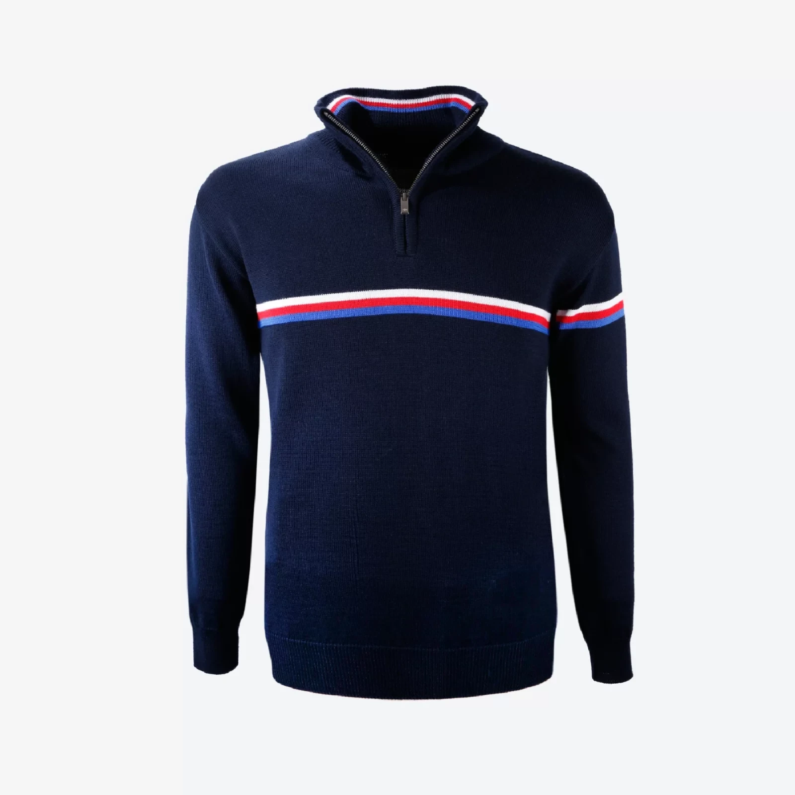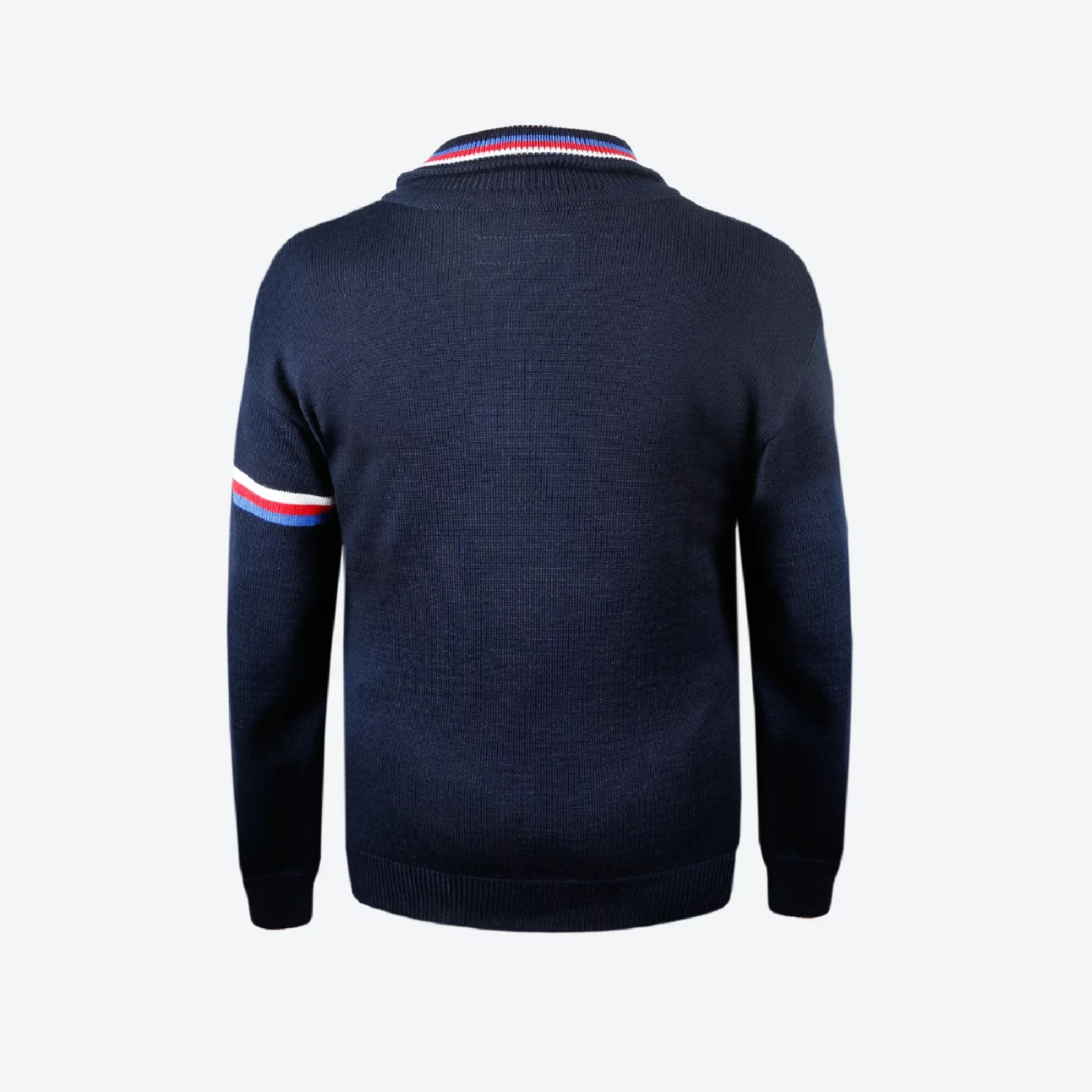 Elegantni jednobojni pulover od vrhunske Merino vune, upotpunjen decentnom trikolorom, idealan je izbor za svakodnevno nošenje.