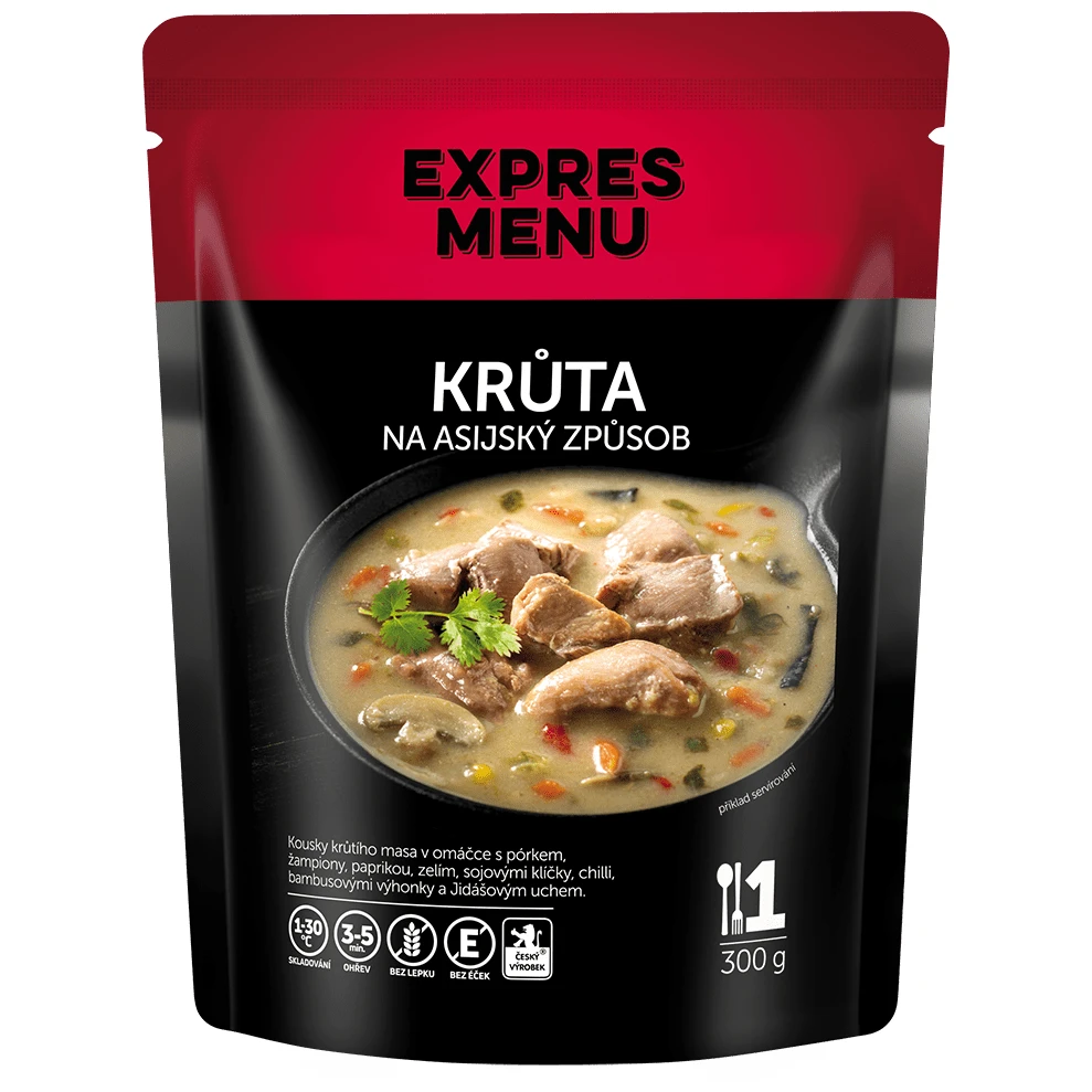 Mješavina purećeg mesa, poriluka, paprike, rajčice, šampinjona, luka i kineskih gljiva s čilijem, sve to možete pronaći u azijskom obroku puretine iz Expres menija. Gotova sterilizirana hrana izrađuje se bez dodataka umjetnih konzervansa. Jelo ne uključuje prilog.