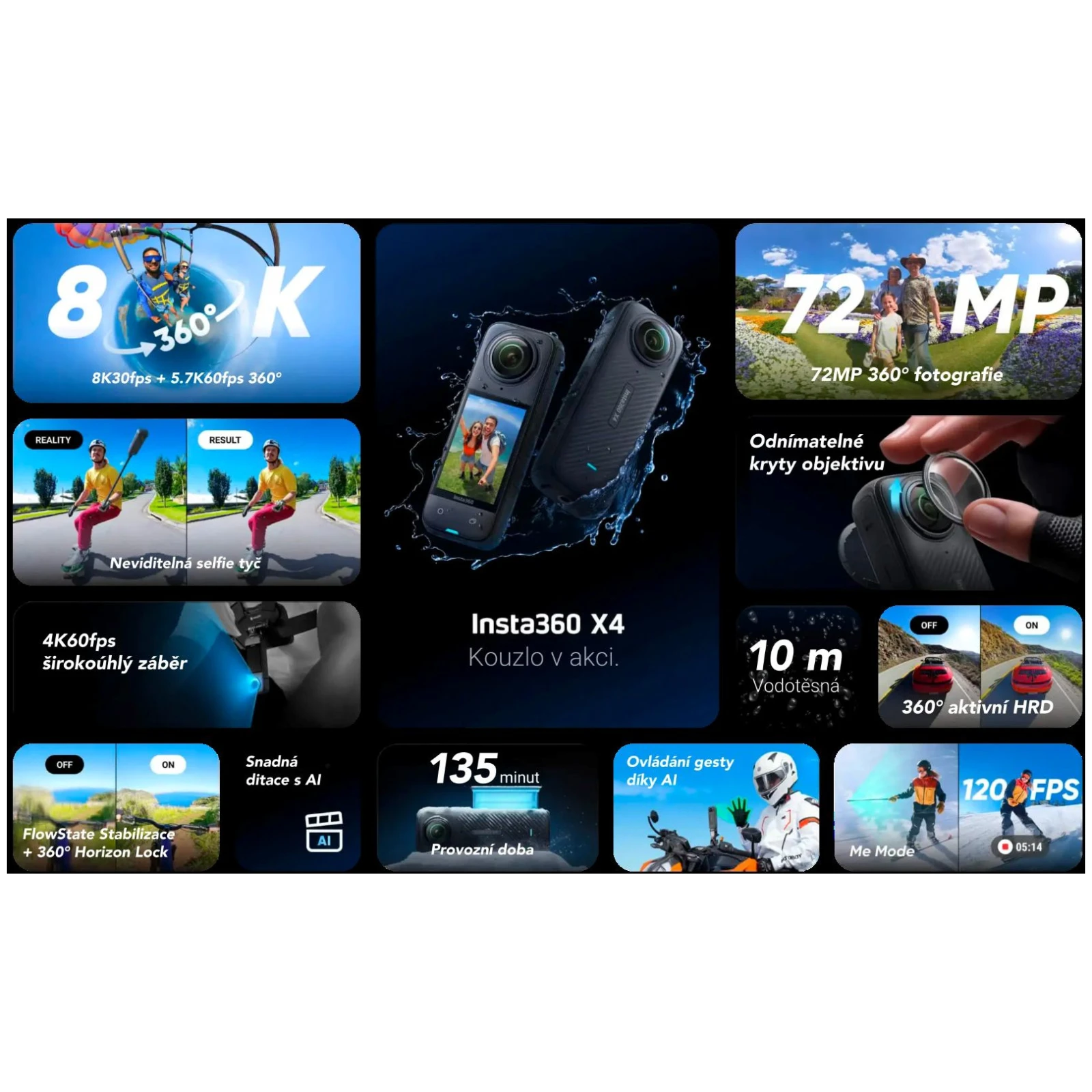 Marka Insta360 nudi širok asortiman kamera i dodatke usmjerene na kreativno snimanje slike – od 360° kamera preko akcijskih „malih“ kamera do profesionalnih modula. Na primjer, model Insta360 X4 donosi 360-stupanjske snimke u 8K rezoluciji i omogućuje korisniku da „kasnije odabere“ kut snimke – zahvaljujući tome što snima sve oko sebe.