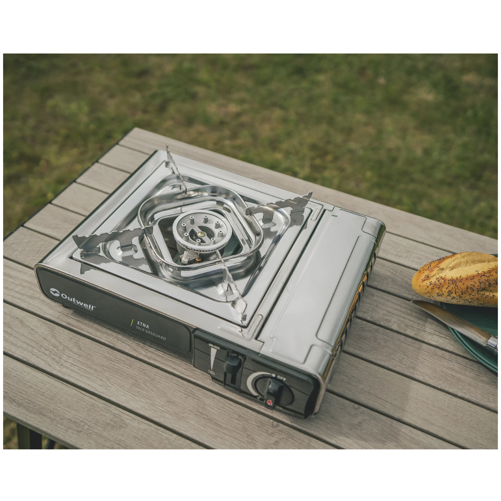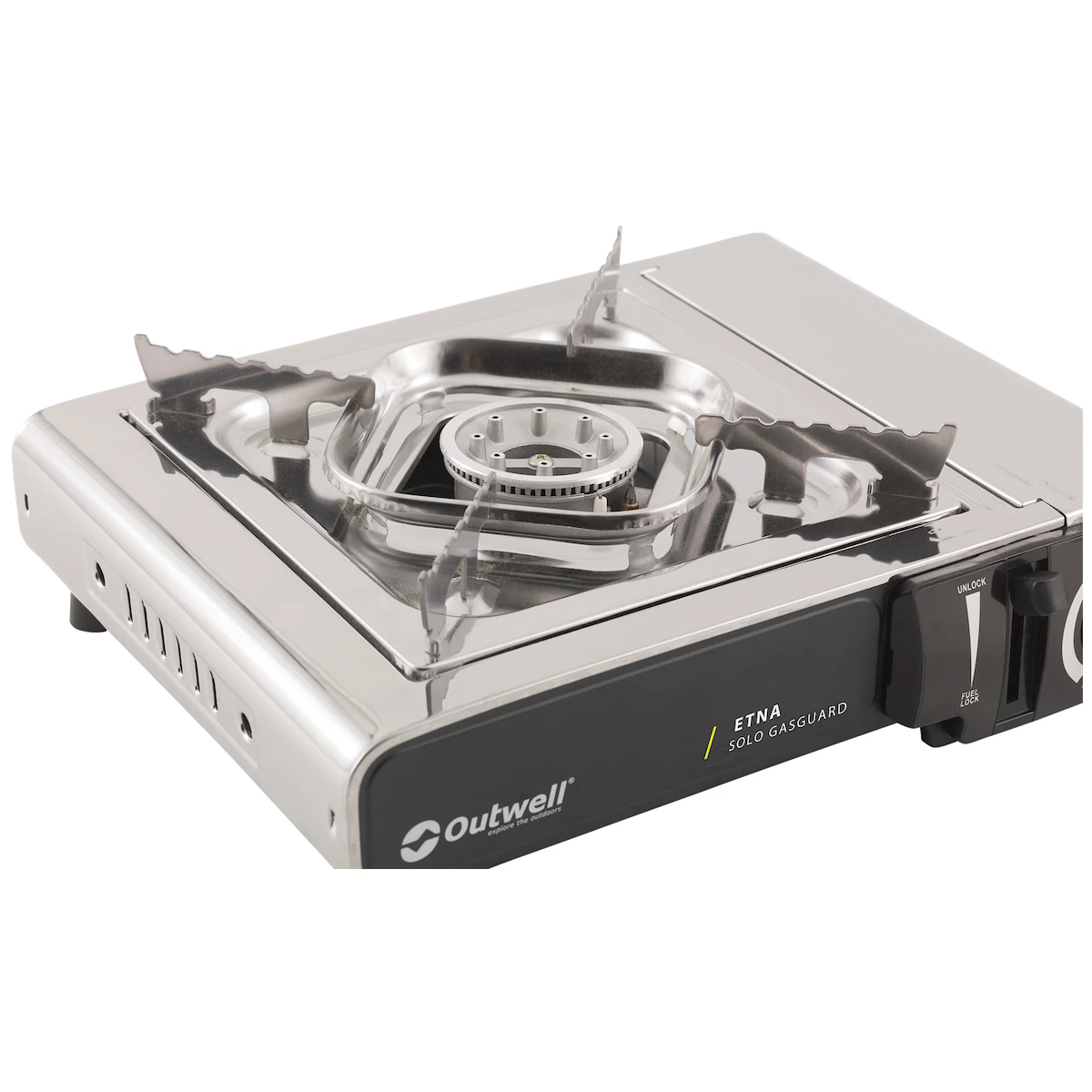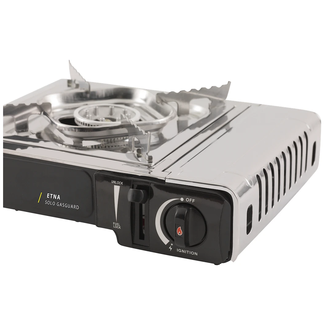 Jednogorični plinski štednjak Etna Solo Gasguard danskog proizvođača Outwell neophodan je pomagač u kampu i u vrtu. Materijal od čelika i nehrđajućeg čelika jamči dug životni vijek. Konstrukcija je niska, vrlo stabilna zahvaljujući plastičnim nožicama i plamenici su opremljeni širokom rešetkom za sigurno postavljanje posude.
