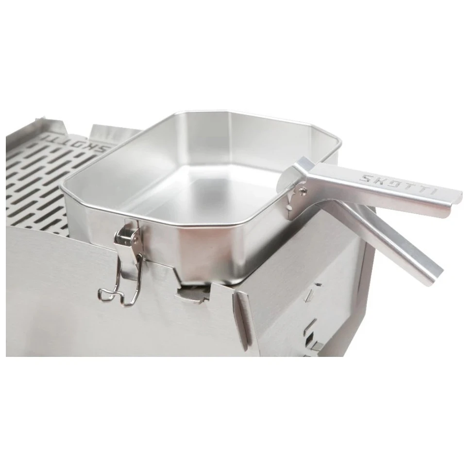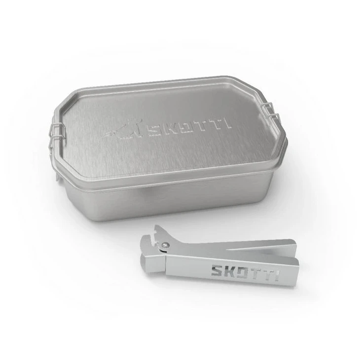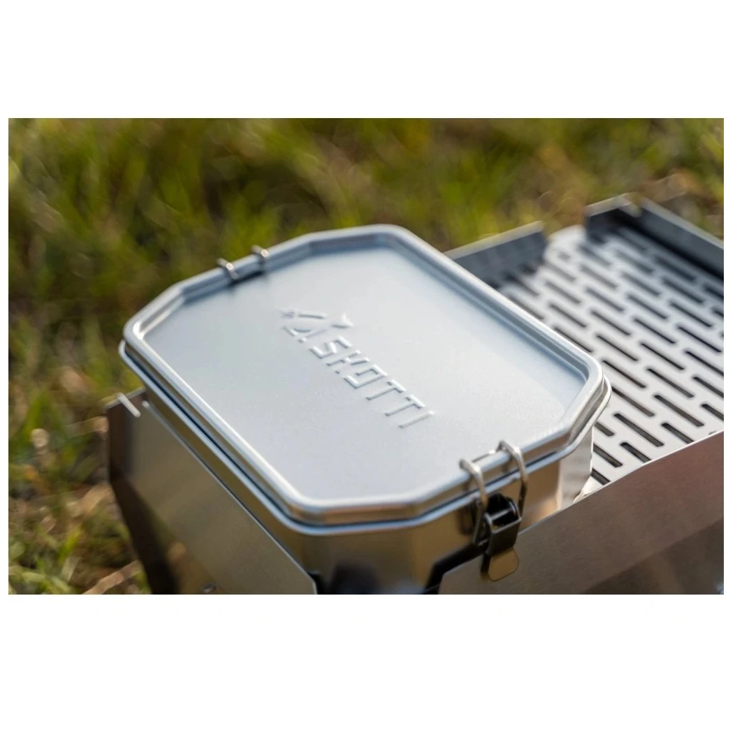 SKOTTI 1L kutija za hranu je multifunkcionalna inox posuda koja proširuje mogućnosti sklopivog roštilja SKOTTI, a istovremeno služi kao izdržljiva kutija za hranu. Zahvaljujući robusnim aluminijskim kliještima, kutija se može sigurno uhvatiti i izravno na roštilju koristiti kao manji lonac ili tava, što je korisno primjerice za zagrijavanje umaka, kuhanje tjestenine ili prženje povrća. Dno kutije zauzima točno polovicu rešetke, tako da možete kuhati i istovremeno na drugoj polovici peći drugo jelo.