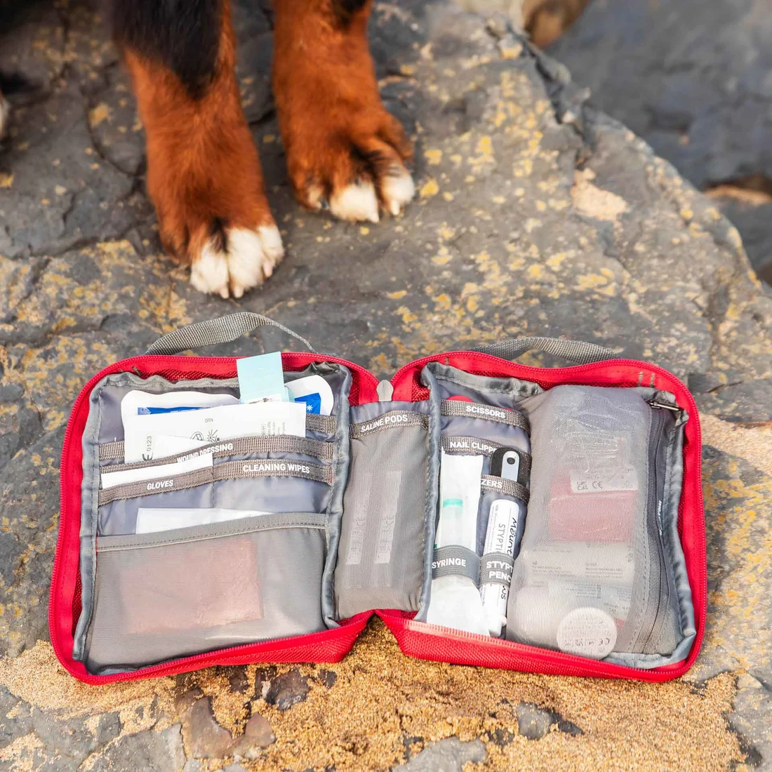 Kompaktna kutija prve pomoći za pse Ultimate Dog First Aid Kit marke Mountain Paws namijenjena je rješavanju neočekivanih manjih ozljeda na putovanjima.