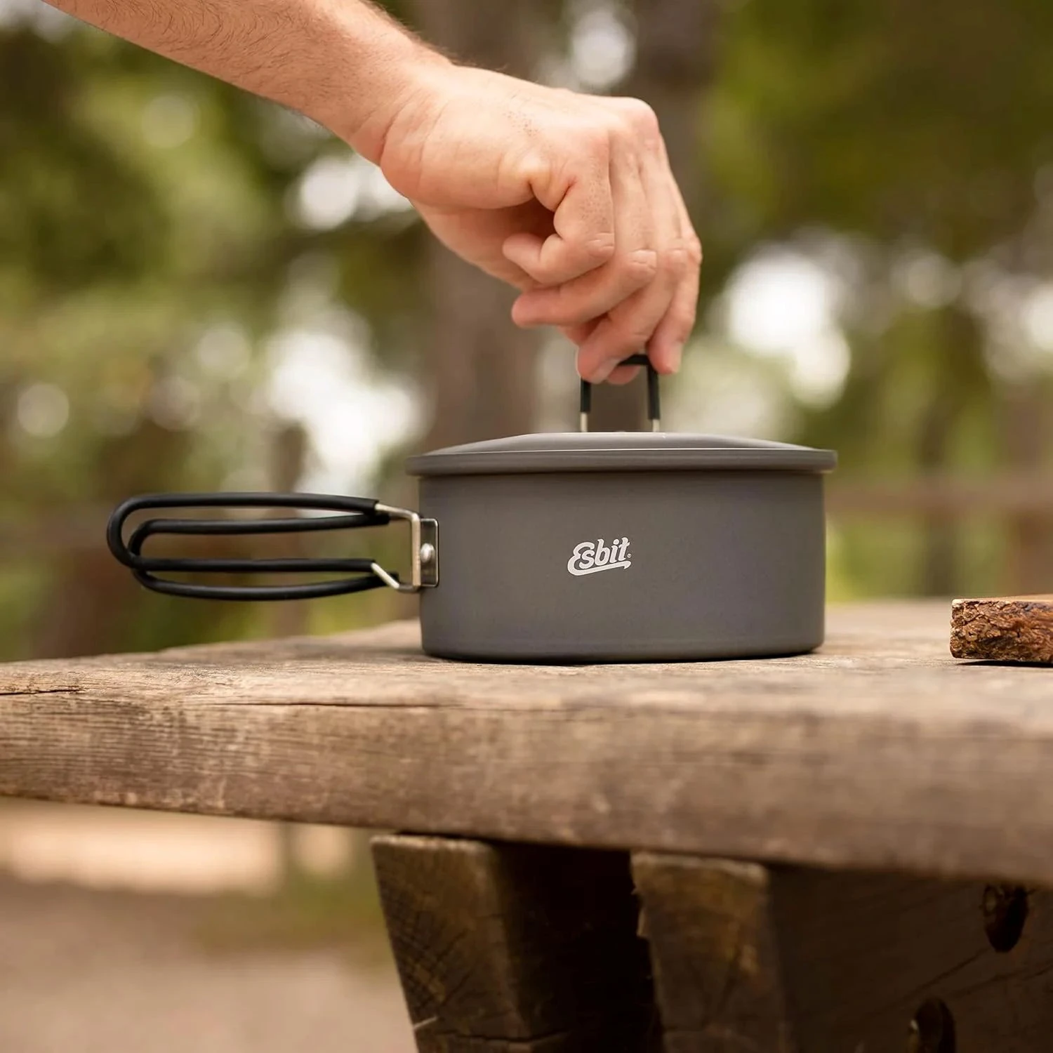 Aluminijska posuda 1,1L Esbit presvučena je silikonom za toplinsku zaštitu. Zahvaljujući posebnom detalju na poklopcu, kuhanje je još ugodnije. Na donjoj strani nalazi se držač. To vam omogućuje da ga objesite na rub kamping lonca. Time se sprječava prljanje poklopca. Istovremeno imate slobodne ruke tijekom kuhanja.