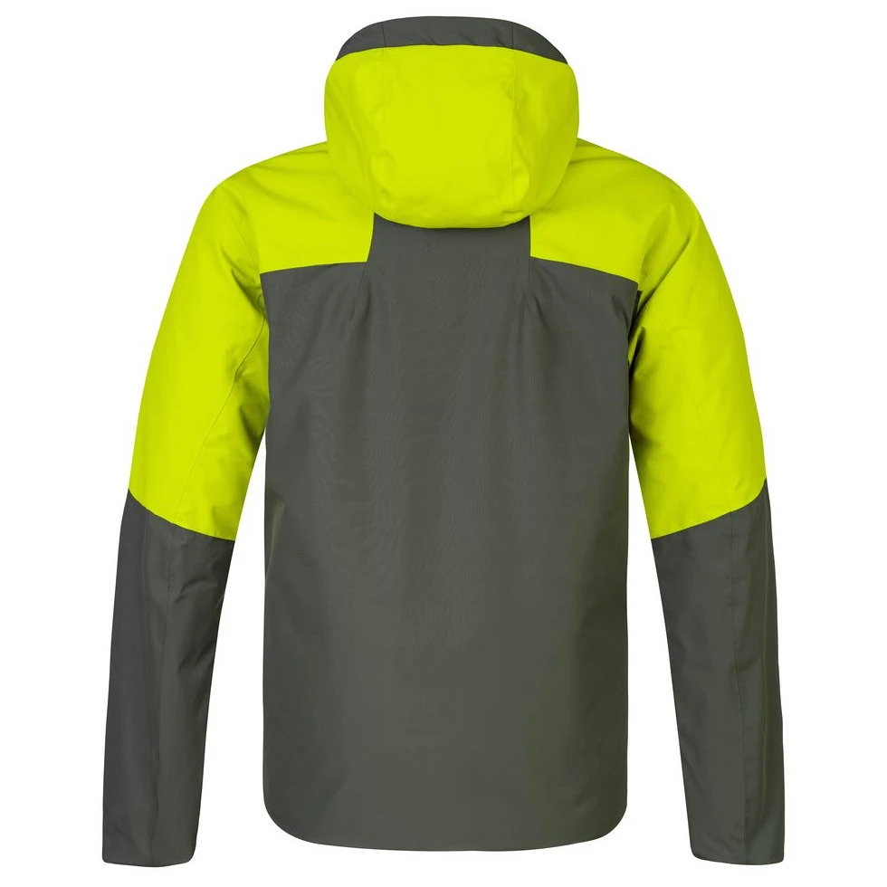 Jakna ima tehnički kroj s anatomski oblikovanim rukavima, kapuljaču koja se ne može skinuti s regulacijom i donji rub s mogućnošću podešavanja širine. Praktični detalji uključuju glavne džepove i džep na prsima s vodootpornim patentnim zatvaračem, džep na rukavu, ventilaciju ispod pazuha, snježnu manžetu u struku, sustav unutarnjih džepova i omču za ključeve. Elastične manžete s otvorom za palac, podešavanje rukava trakom na čičak i lijepljeni šavovi jamče zaštitu od prodora snijega i zadržavanje topline.