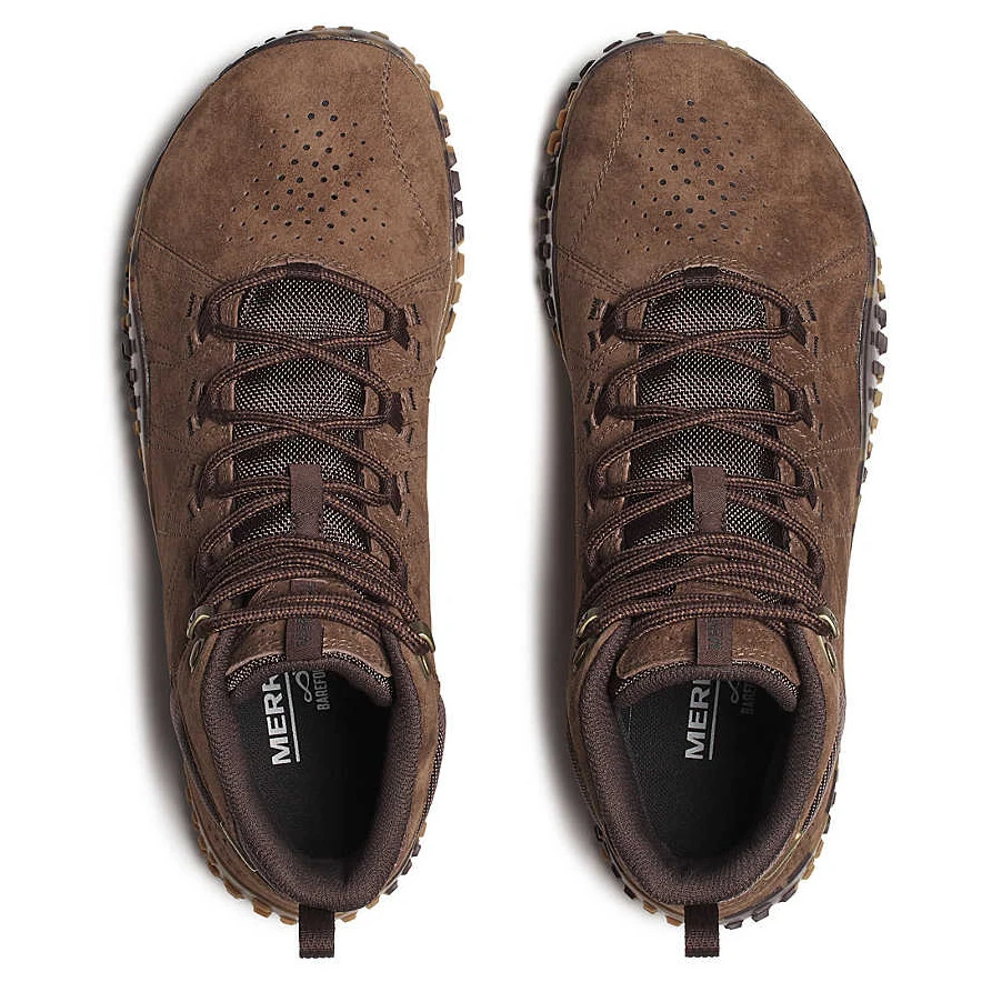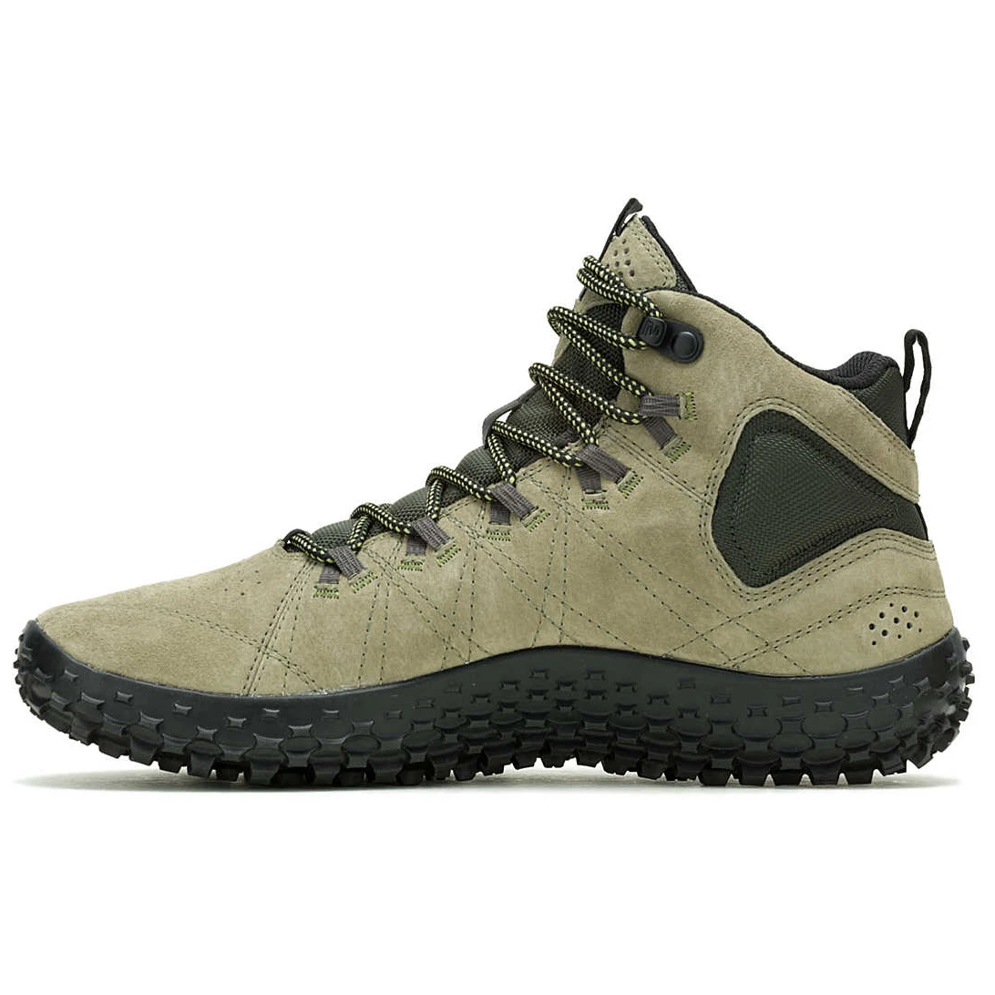 Muške planinarske čizme Wrapt Mid WP Marka Merrell svestrana je cipela s grubim gumenim potplatom, dio kolekcije za bosonoge. Potplat je dizajniran da kopira oblik stopala i osigura isti položaj stopala kao hodanje bosih nogu.