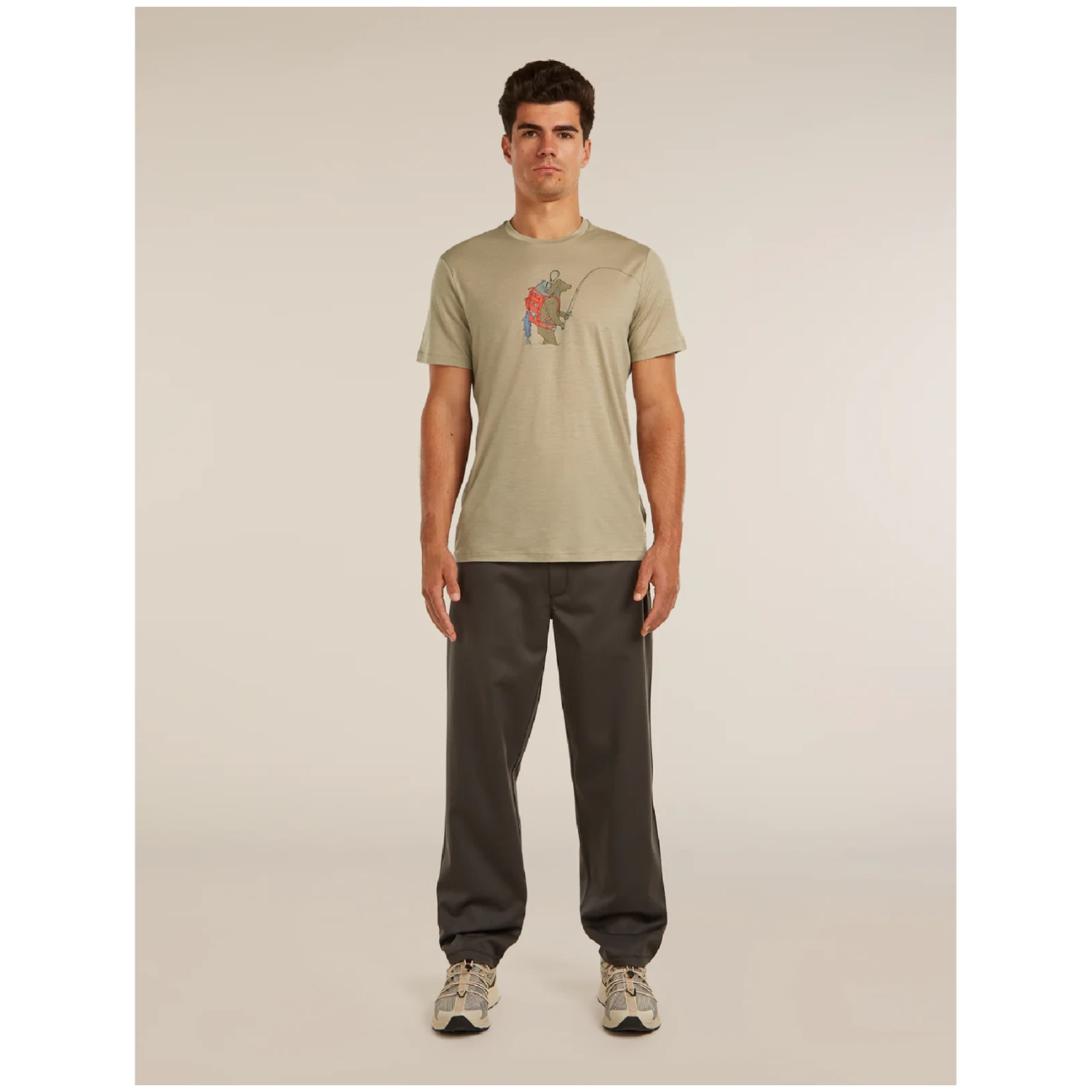 Redoviti kroj nudi uravnotežen omjer udobnosti i slobode kretanja. Pomaknuti rameni šavovi pomažu smanjiti trenje, na primjer, pri nošenju ruksaka. Originalna grafika s motivom medvjeda daje majici osobit izgled, dok prirodni materijal bez sintetičkih vlakana naglašava njezin održivi karakter.