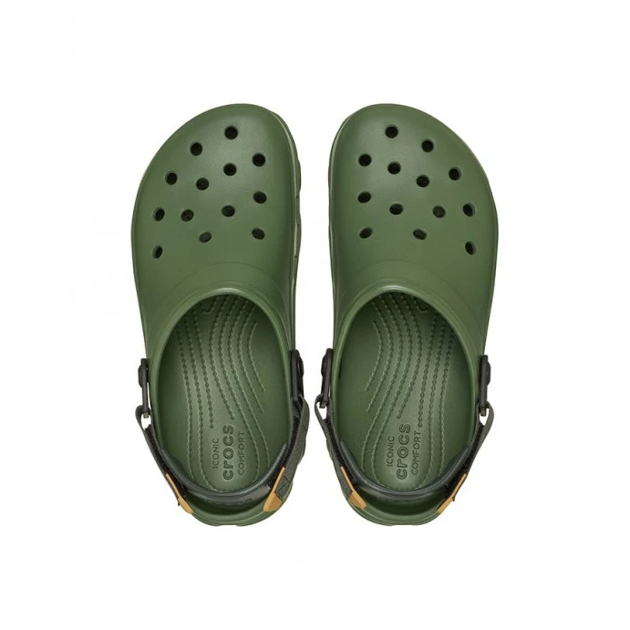 Crocs All Terrain Clog papuče dizajnirane su za putovanja, ekspedicije i zahtjevne terene. Izdržljivi potplat s izraženim profilom osigurava stabilnost i prianjanje, dok podesivi Turbo Strap čvrsto drži stopalo na mjestu. Lagani i potpuno oblikovani Croslite™ pjenasti gornji dio pruža udobnost i lako održavanje – samo isperite i brzo se suši. Ventilacijski otvori potiču protok zraka i odvod vode, a mogućnost dodavanja Jibbitz™ ukrasa omogućuje svakome da ih prilagodi.