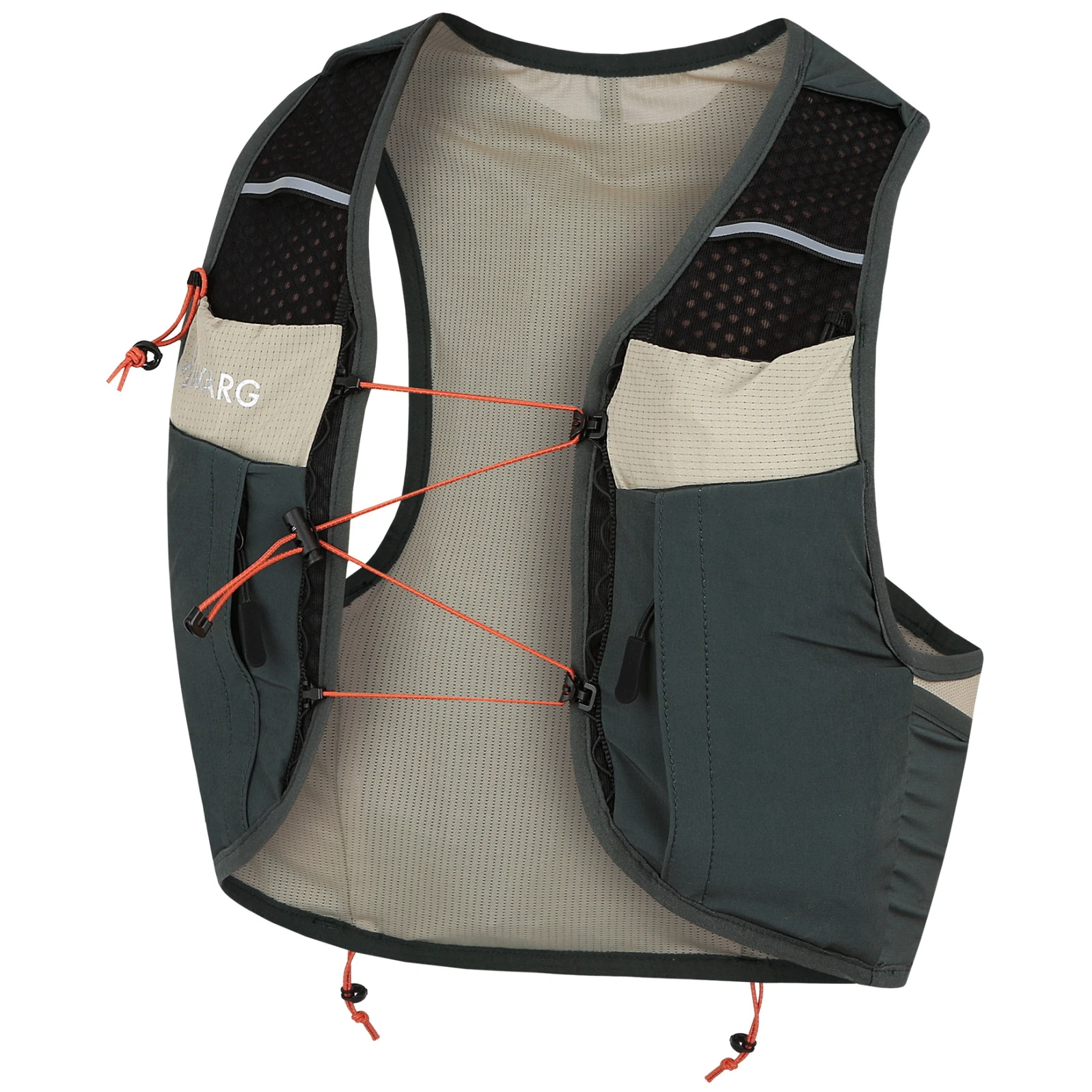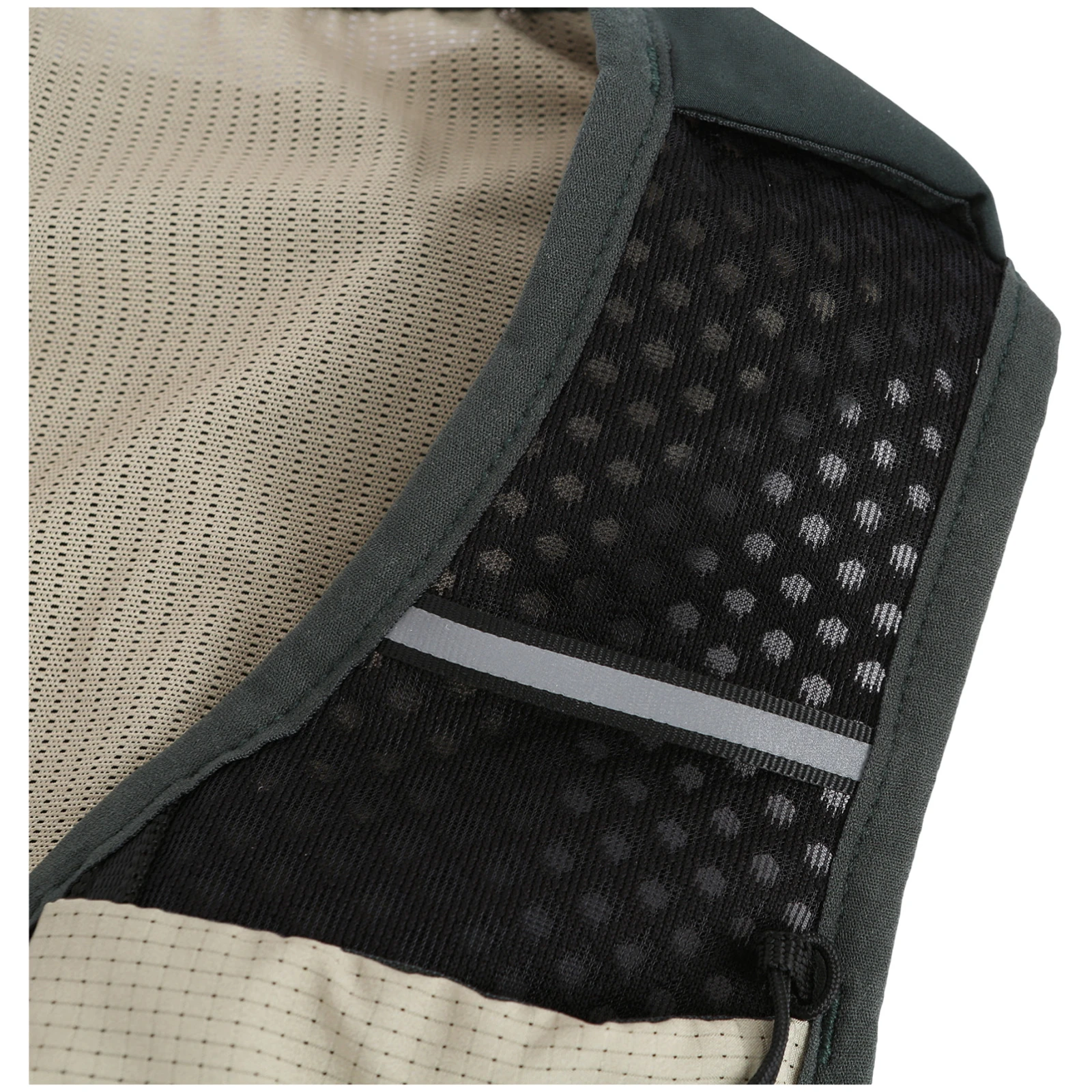 Prsluk je izrađen od prozračnog mrežastog materijala, koji osigurava dobro prozračivanje i udobnost čak i pri intenzivnom opterećenju. Podesive prsne vezice omogućuju stabilno pristajanje uz tijelo, prilagođavajući se građi i količini nošene opreme. Na leđima se nalazi džep s patentnim zatvaračem i džep s čičkom, dopunjeni elastičnim vrpcama, koje se mogu koristiti za pričvršćivanje opreme (npr. jakne) ili za stezanje sadržaja džepa. Tu je i prostor za mjehur za vodu, koji omogućuje udobno dopunjavanje tekućine tijekom trčanja.