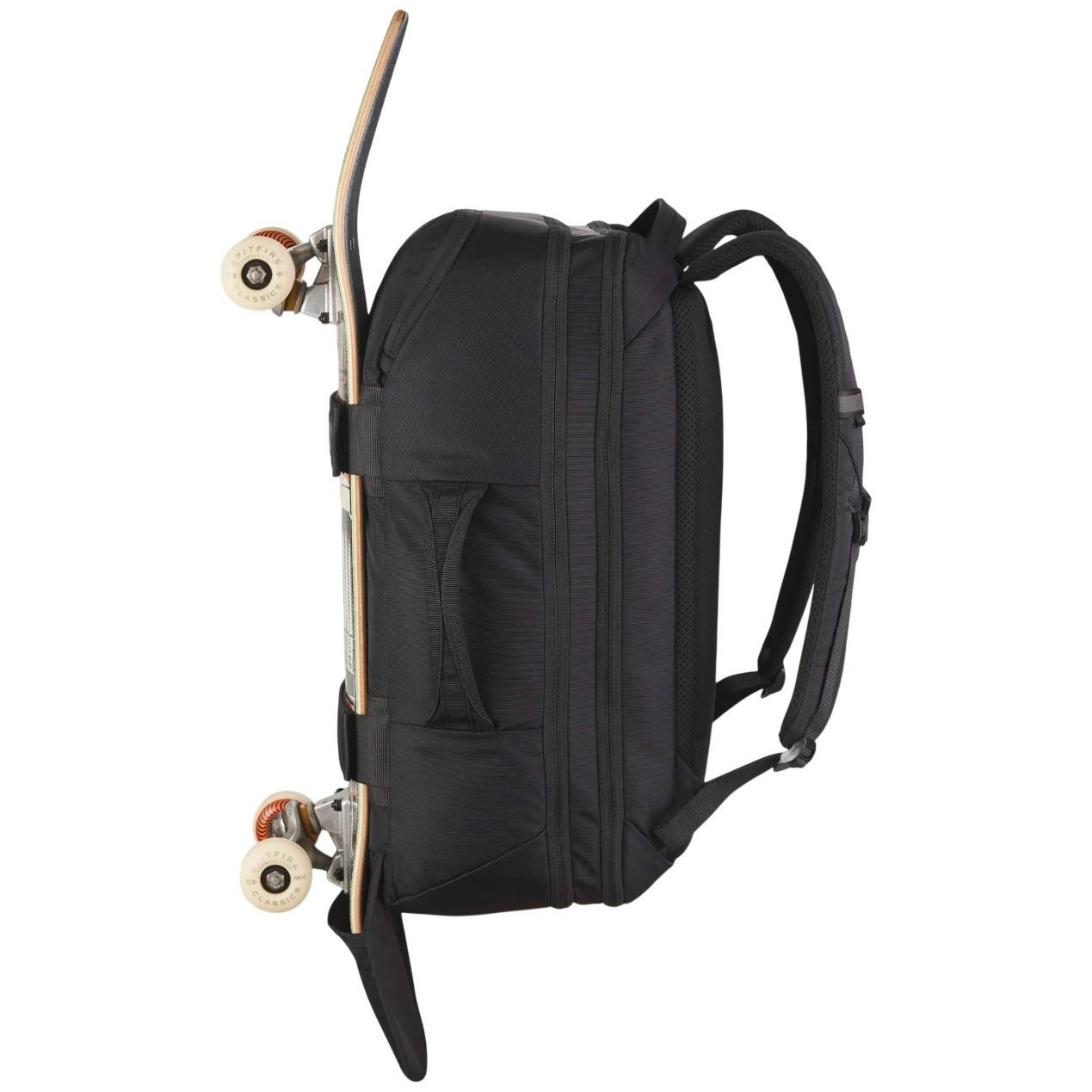 Izdržljivi materijal upotpunjen je čvrstom stražnjom pločom i naramenicama s prsnim remenom. Glavni pretinac nudi podstavljeni džep za prijenosno računalo i prostor za knjige. Osim toga, ruksak ima džepove za ostalu opremu i mrežasti džep za bocu s pićem. S prednje strane nalaze se trake za pričvršćivanje skateboarda. Na ove trake možete postaviti originalne zakrpe na čičak.