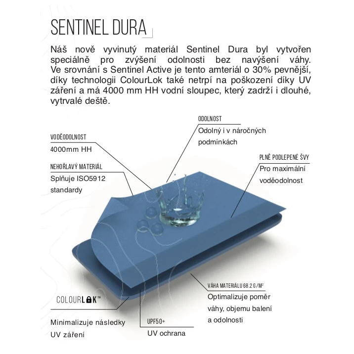 Tropiko šator izrađen je od vrlo izdržljive i pouzdane tkanine Sentinel Dura. Glavne prednosti ove tkanine uključuju omjer snage i težine, tehnologiju ColourLokkoja pomaže u održavanju boje tkanine od UV zračenja i čvrstoću koja je 30% veća od modela s tkaninom Sentinel Active. Tropiko također ima vodeni stupac od 4000 mm, UV zaštitu UPF50+ i potpuno zalijepljene šavove iz tvornice. Unutarnji šator izrađen je od vrlo prozračnog poliestera i zatamnjen je. Zahvaljujući zamračenju, možete mirno spavati čak i za vrijeme izlaska sunca.