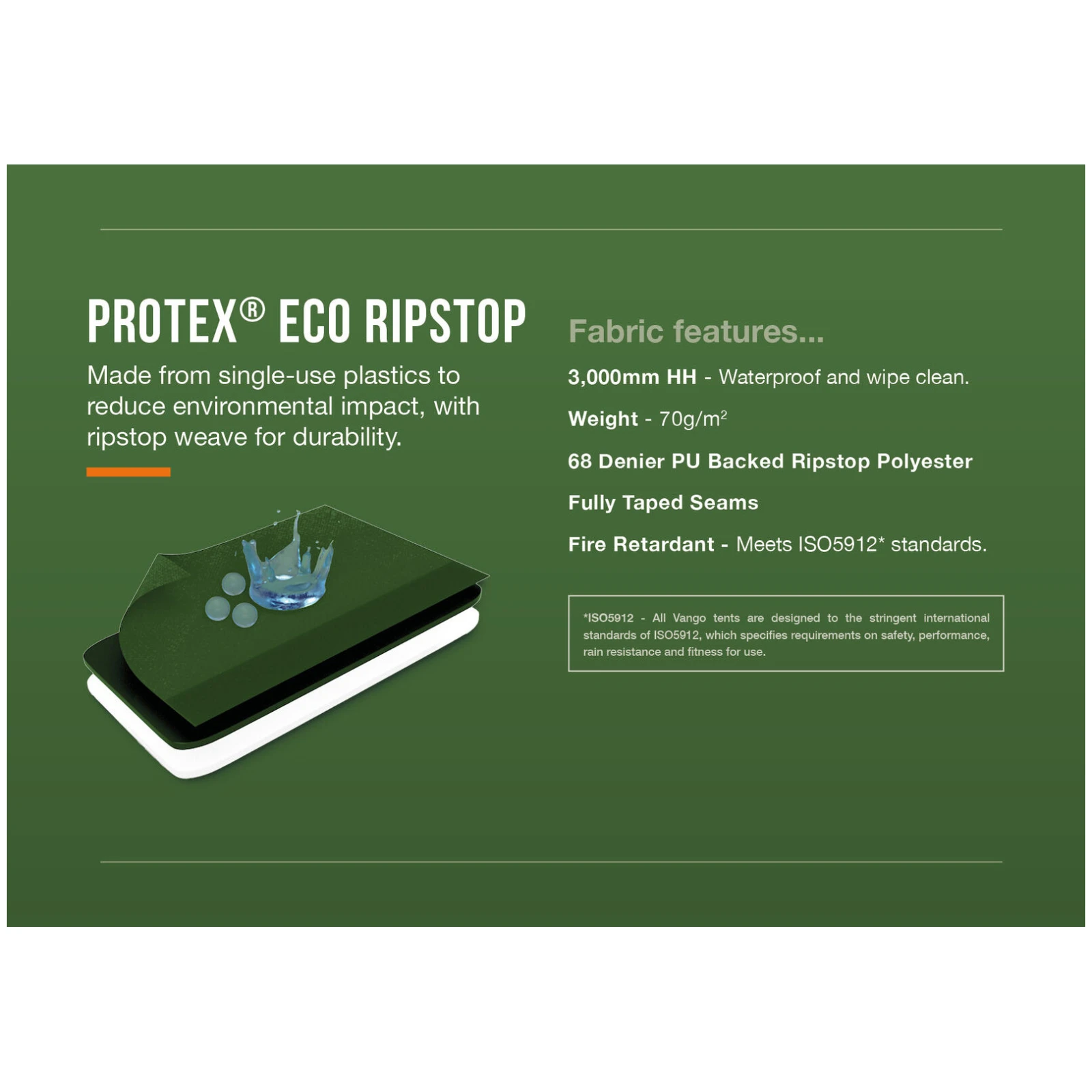 Vanjski sloj Protex Eco Ripstop od izdržljivog poliestera nudi vodootpornost od 3000 mm HH i potpuno zalijepljene šavove, što osigurava pouzdanu zaštitu od kiše. Podnica od 70D PU poliestera s vodenim stupcem od 6000 mm HH je izdržljiva, lako se čisti i zahvaljujući konstrukciji u obliku kade štiti unutrašnjost šatora čak i u nepovoljnim vremenskim uvjetima.