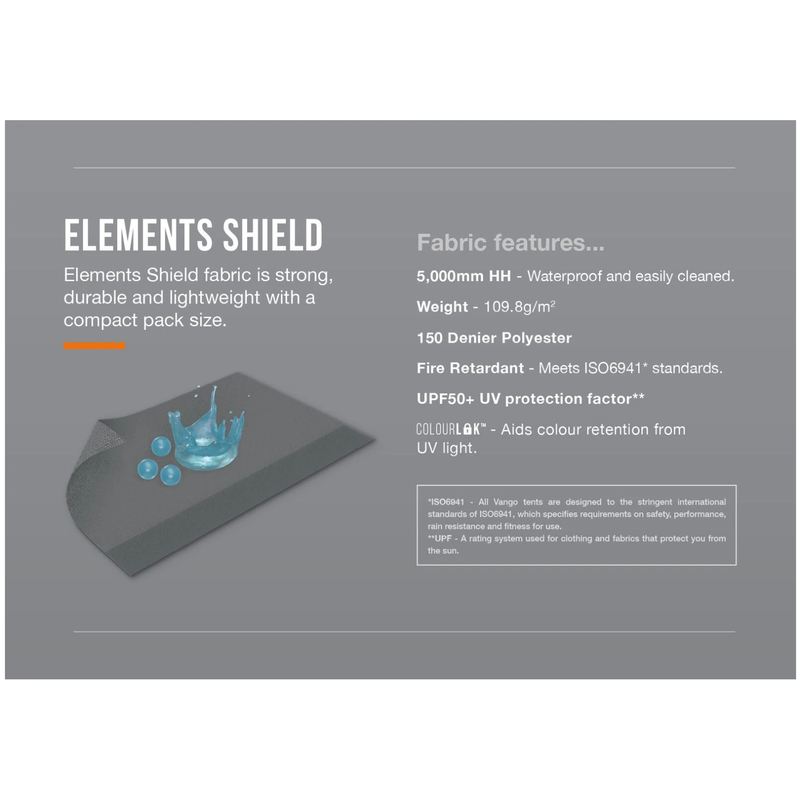 Lagana, a istovremeno otporna tkanina Elements Shield 150D s vodenim stupcem od 5 000 mm osigurava pouzdanu zaštitu od kiše i nepovoljnih vremenskih uvjeta, dok tehnologija ColourLok pomaže zadržati boje postojanima čak i pri čestoj uporabi. Veliki Diamond Clear prozori pružaju izvrstan pogled na okolicu i dovoljno dnevnog svjetla, dok patentni zatvarači omogućuju jednostavno reguliranje privatnosti prema potrebi.