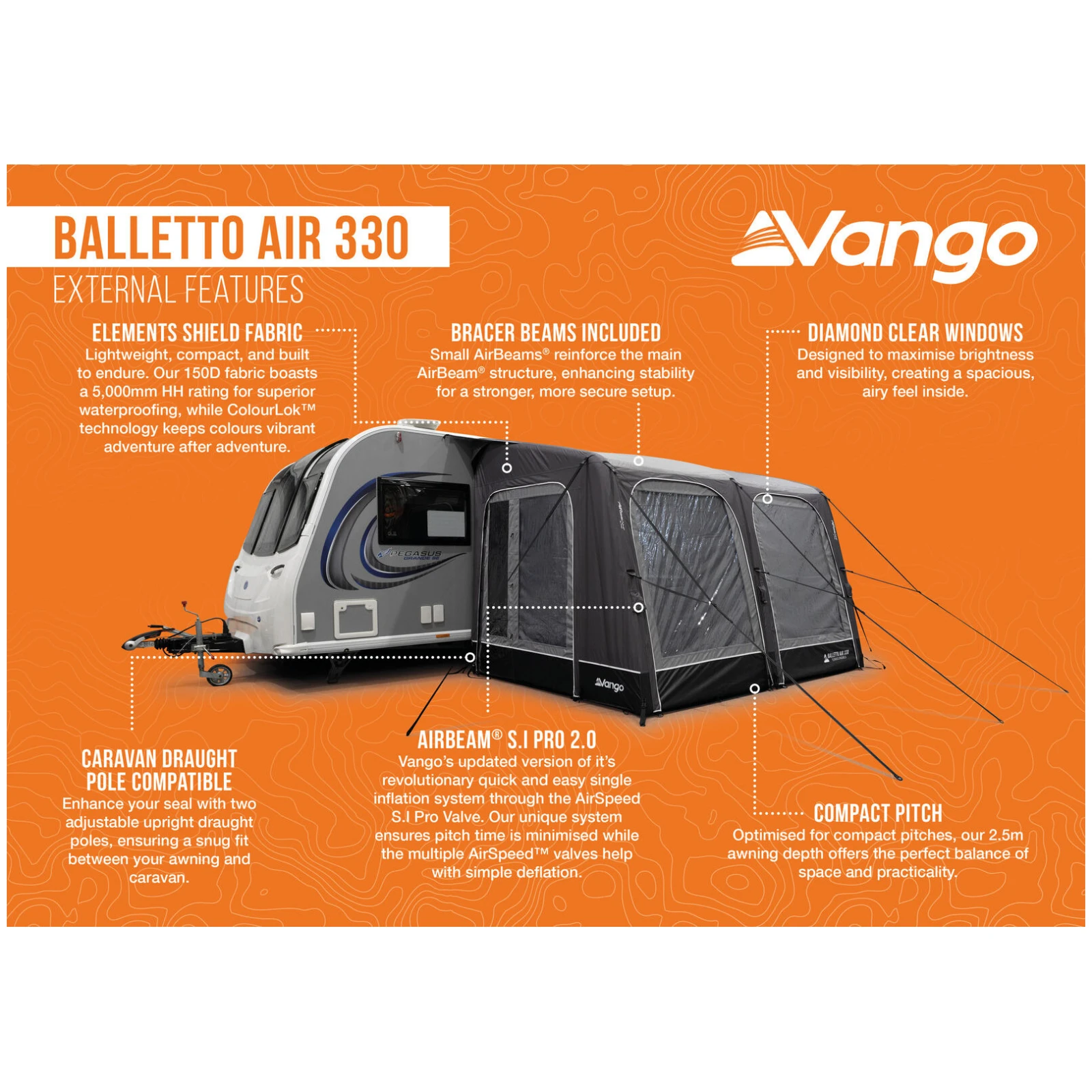 Vango Balletto Air 330 predšator nudi idealno okruženje za odmor, obiteljsko objedovanje i praktičan prostor za pohranu tijekom kampiranja. Zahvaljujući revolucionarnom jednobodnom napuhavanju i višebodnom ispuhivanju sustava AirBeam®, njegovo postavljanje i pakiranje iznimno je brzo i jednostavno, tako da Vam ostaje više vremena za uživanje u odmoru.