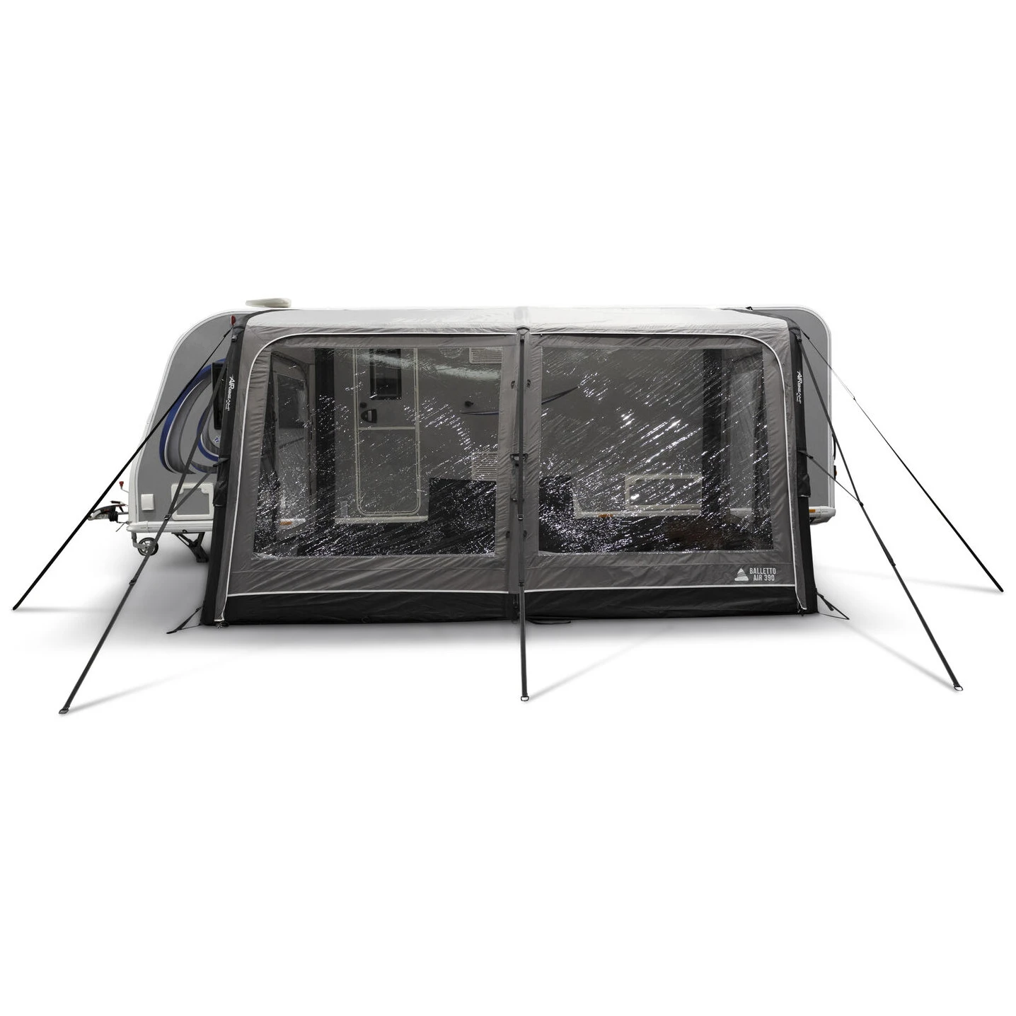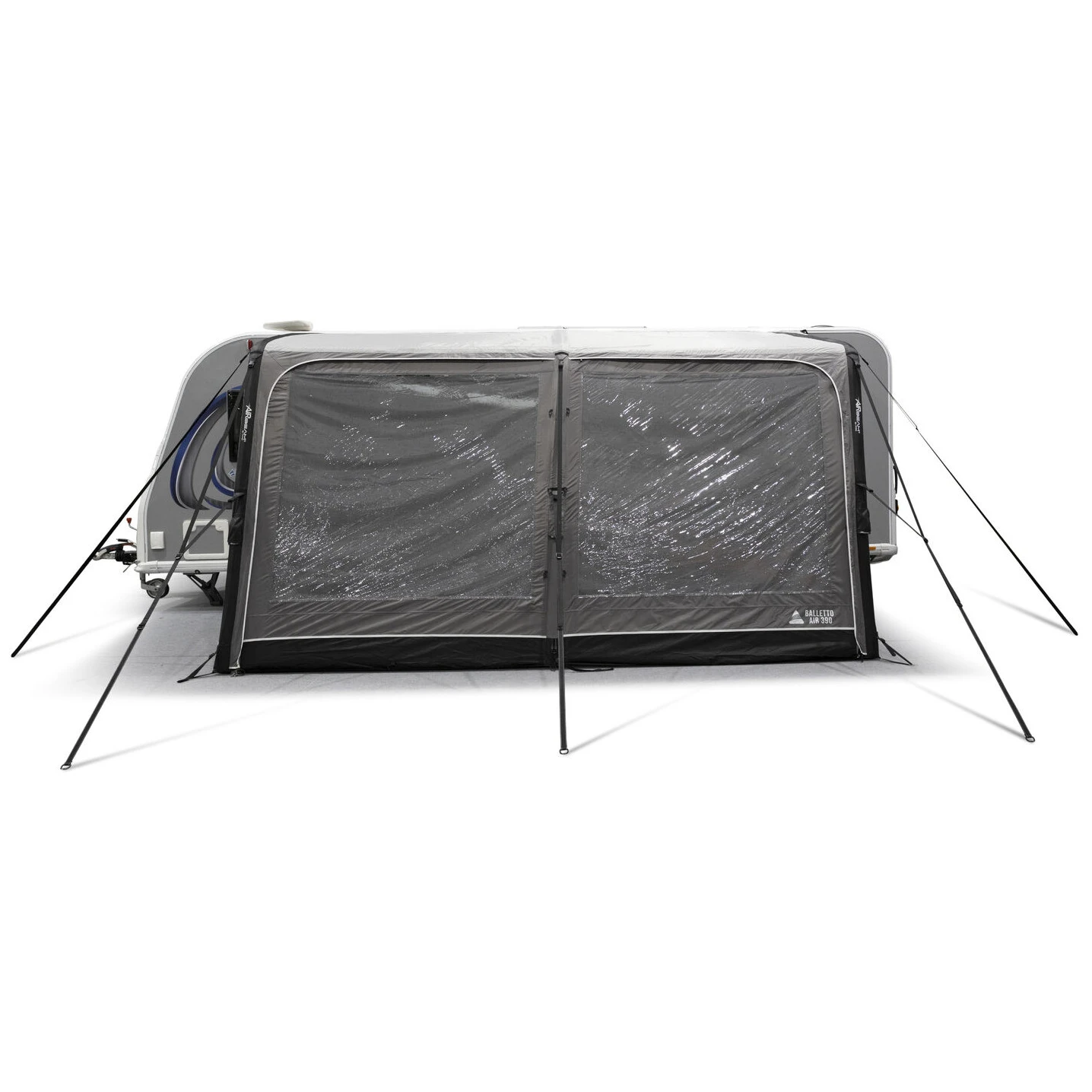 Balletto Air 390 je kompatibilan s različitim vrstama kamp prikolica zahvaljujući podesivom Kador sustavu i mogućnosti podešavanja visine u rasponu od 235–250 cm. Promišljeni detalji, poput sustava brtvljenja protiv propuha 2.0, odvojivih bočnih vrata, podijeljenog ulaza 60/40 ili SkyTrack II sustava vješanja, osiguravaju visoku variabilnost i udobnost pri svakom kampiranju.