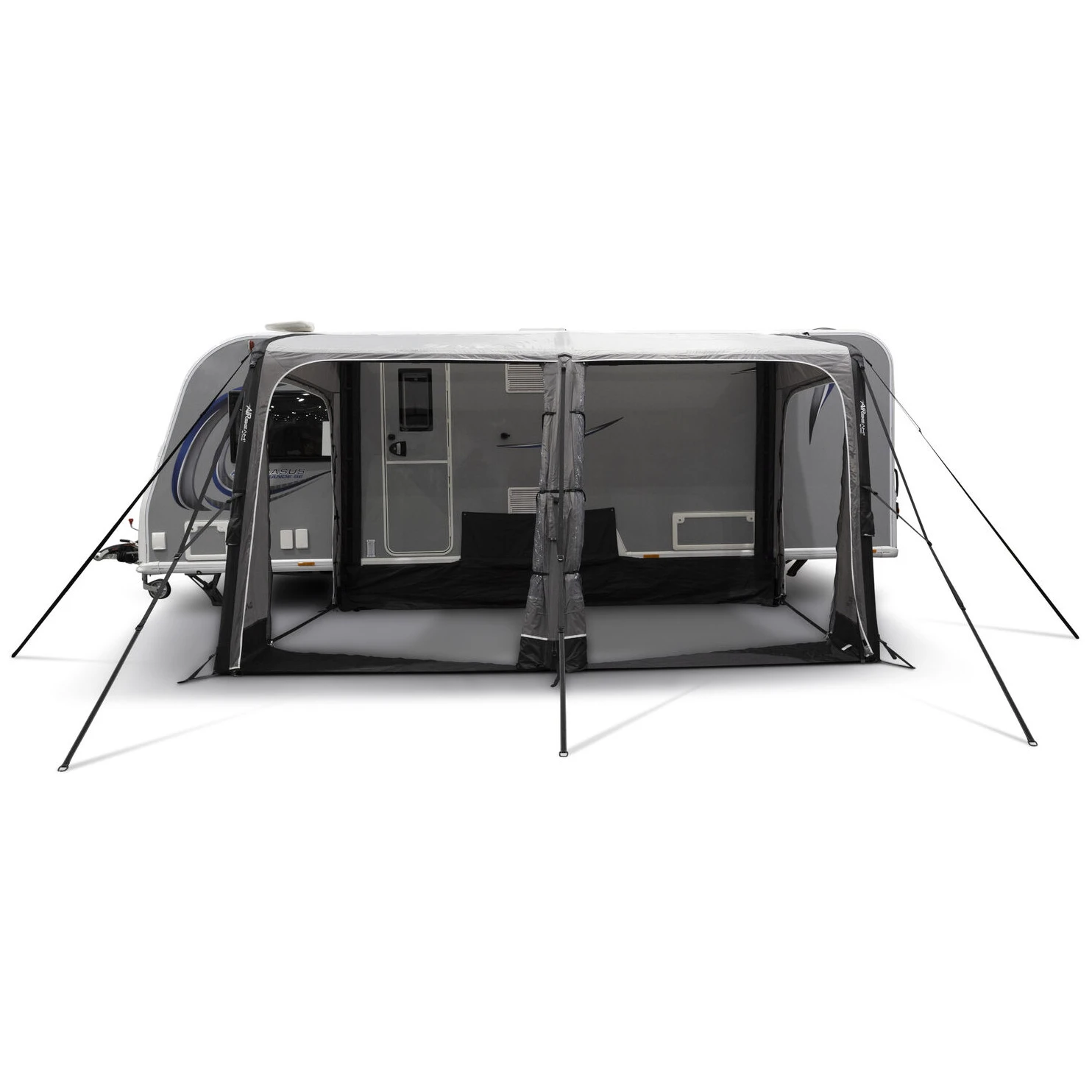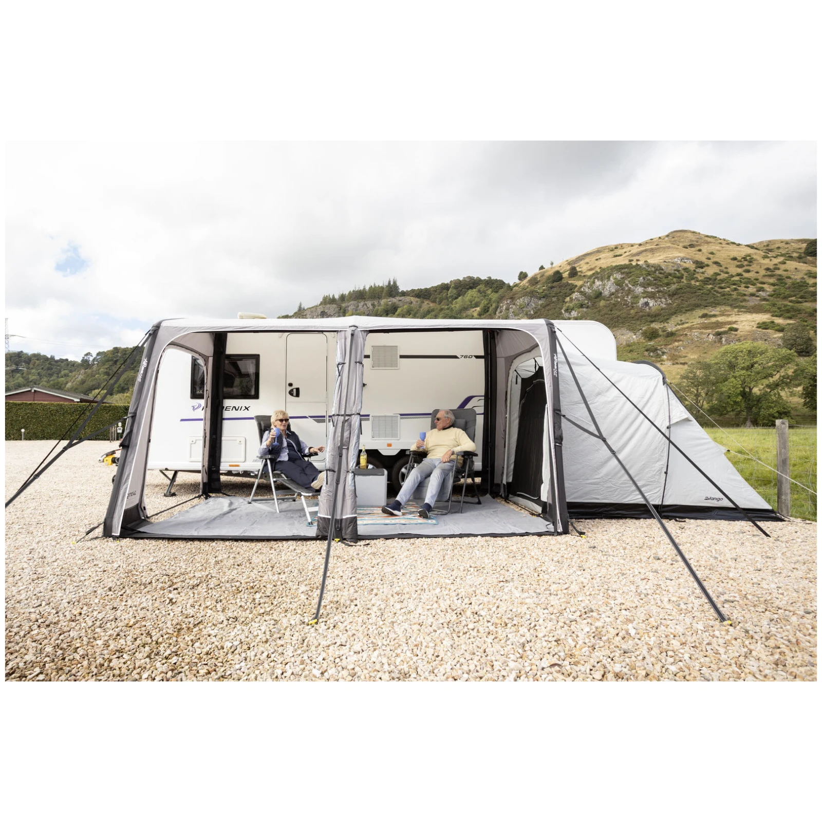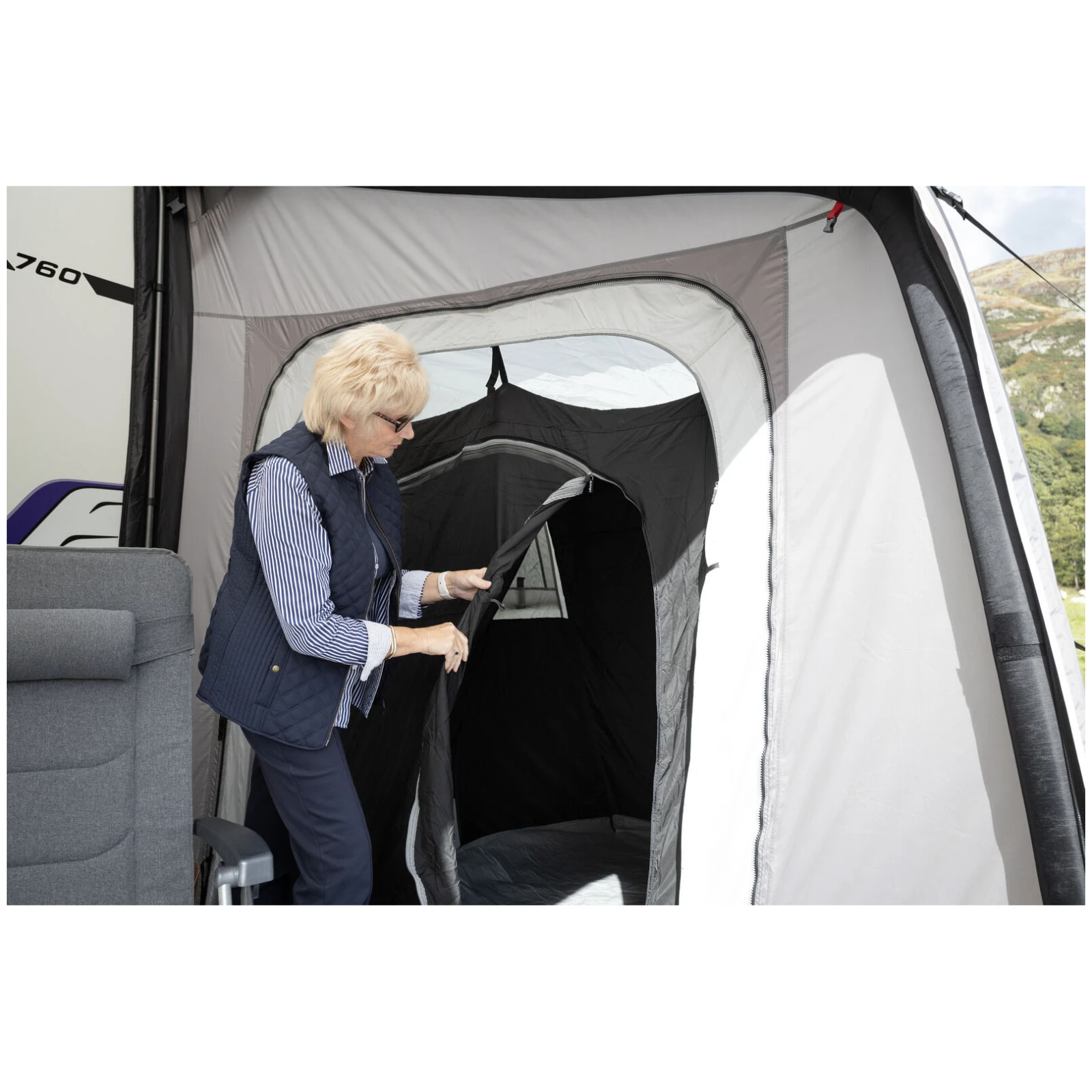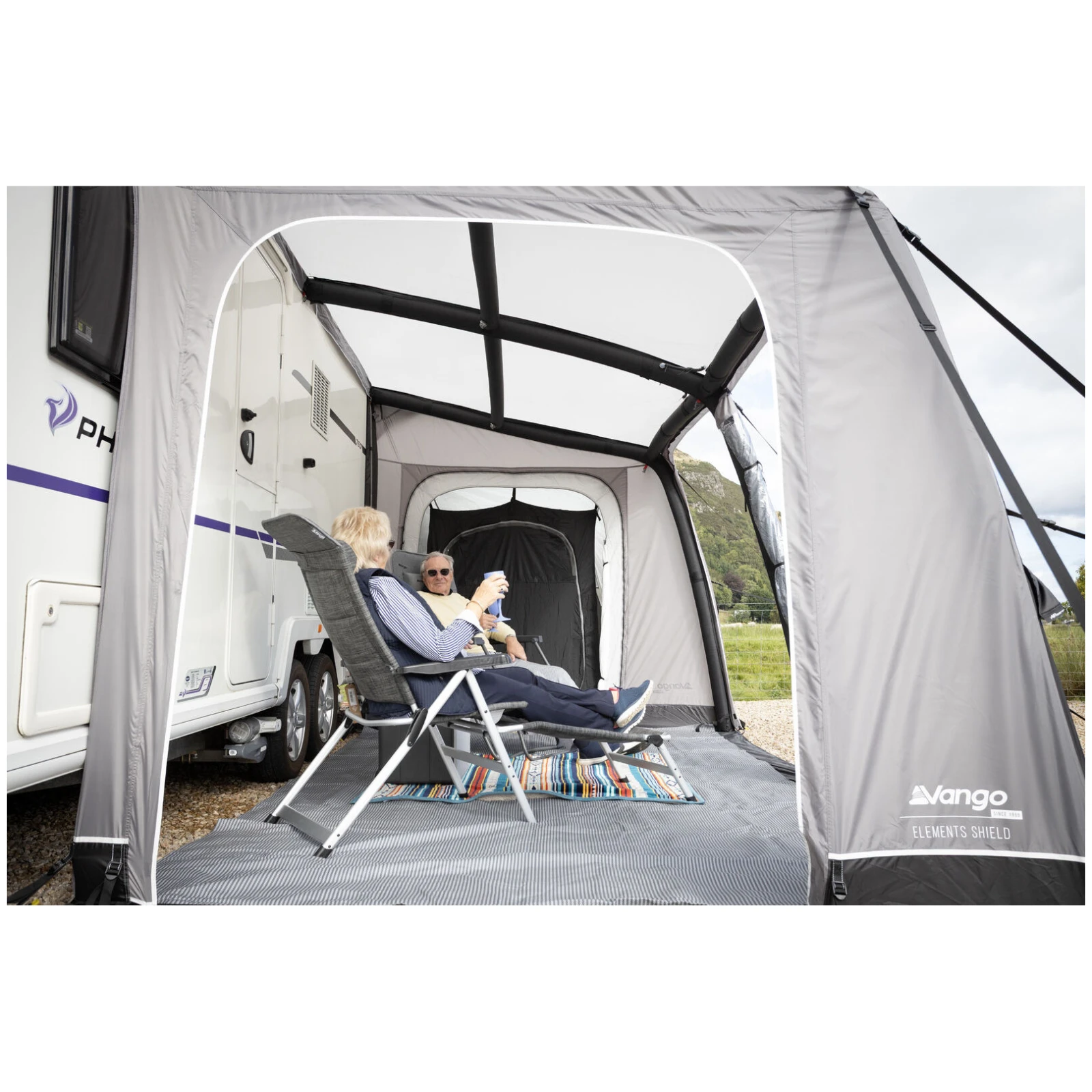 Veliki panoramski prozori Diamond Clear osiguravaju izvrstan pogled na okolinu i dovoljno dnevnog svjetla, dok patentni zatvarači omogućuju jednostavno podešavanje privatnosti. Ergonomski oblikovane i unaprijed zakrivljene potporne šipke povećavaju unutarnji prostor i stabilnost čak i u vjetrovitijim uvjetima. Za maksimalan komfor, paket također uključuje zaštitu od vjetra i pokrove za prostor ispod kotača koji sprječavaju prodor hladnoće.