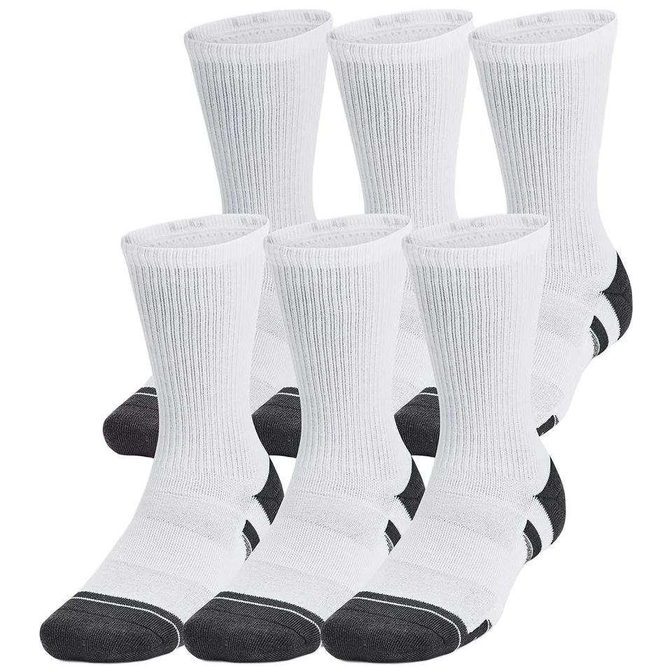Unisex Perf Tech 6Pk Crew čarape marke Under Armour su izdržljive, odvode znoj i stvarno se brzo suše. Nova konstrukcija Locked-In Fit drži čarapu sigurno na peti. Čarape imaju srednje jastučiće po cijeloj površini stopala i mrežaste panele na ristu za veću prozračnost. Ugrađena potpora za luk stopala pomaže smanjiti umor nogu.