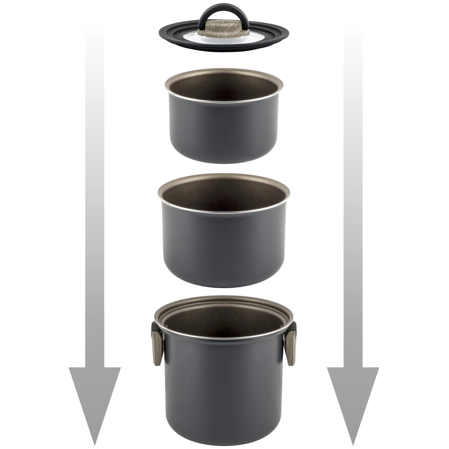 Vanjska posuda/tava ima sklopive ručke za kompaktno i prostorom štedljivo skladištenje. Ovaj svestrani set kompatibilan je sa svim vrstama ploča za kuhanje, uključujući indukcijske. Uključena je odvojiva ručka za unutarnje posude i tave.