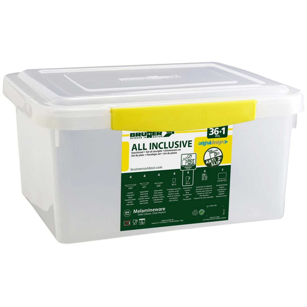 Sveobuhvatni All Inclusive Blue Ocean set marke Brunner sadrži potpunu opremu za kampiranje. Set se sastoji od 36 komada posuđa i pribora za jelo i namijenjen je za 4 osobe. U kampu ćete sigurno cijeniti povećanu izdržljivost zahvaljujući melaminu . Ovaj materijal je otporan na udarce, lako se čisti, otporan je na toplinu i vlagu, bez mirisa i okusa te je ekološki prihvatljiv. Posuđe se može staviti u zamrzivač kao i u perilicu posuđa.