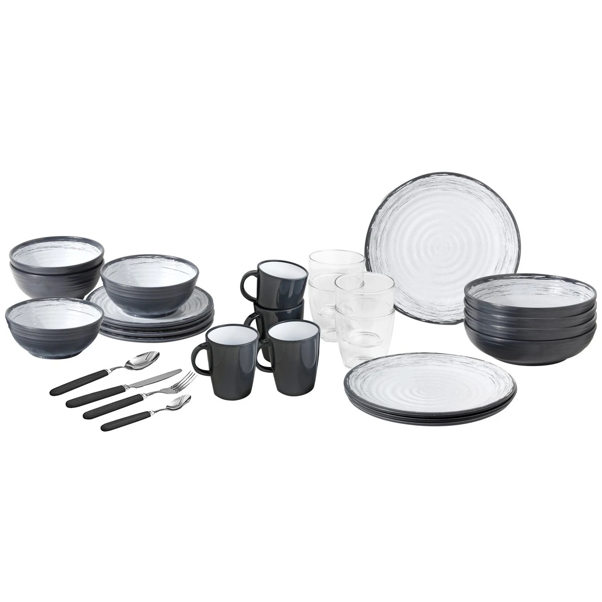 Set sadrži 4 velika tanjura (Ø 26 cm), 4 duboka tanjura (Ø 21 cm), 4 manja tanjura (Ø 21 cm ), 4 šalice kapaciteta 30 cl, 4 zdjele (Ø 15 cm), 4 čaše kapaciteta 20 cl, pribor za jelo (16 kom) i kutija za odlaganje. Posuđe je pogodno za pranje u perilici posuđa.