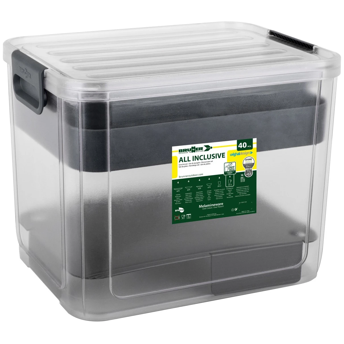 Set posuđa All Inclusive VIP Granada Brunner sadrži ukupno 40 komada, izrađenih od kombinacije melamina i mineralnog praha za otpornost na lomljenje, s dodatkom protuklizne gume.