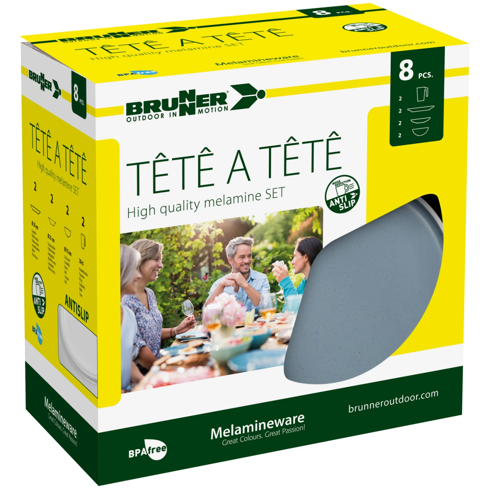 Set posuđa Dolomit Set tete-a-tete marke Brunner sadrži osnovnu opremu za kampiranje. Set se sastoji od 8 posuda i namijenjen je za 2 osobe. U kampu ćete sigurno cijeniti povećanu izdržljivost zahvaljujući melaminu . Ovaj materijal je otporan na udarce, lako se čisti, otporan je na toplinu i vlagu, bez mirisa i okusa te je ekološki prihvatljiv. Posuđe se može staviti u zamrzivač kao i u perilicu posuđa.