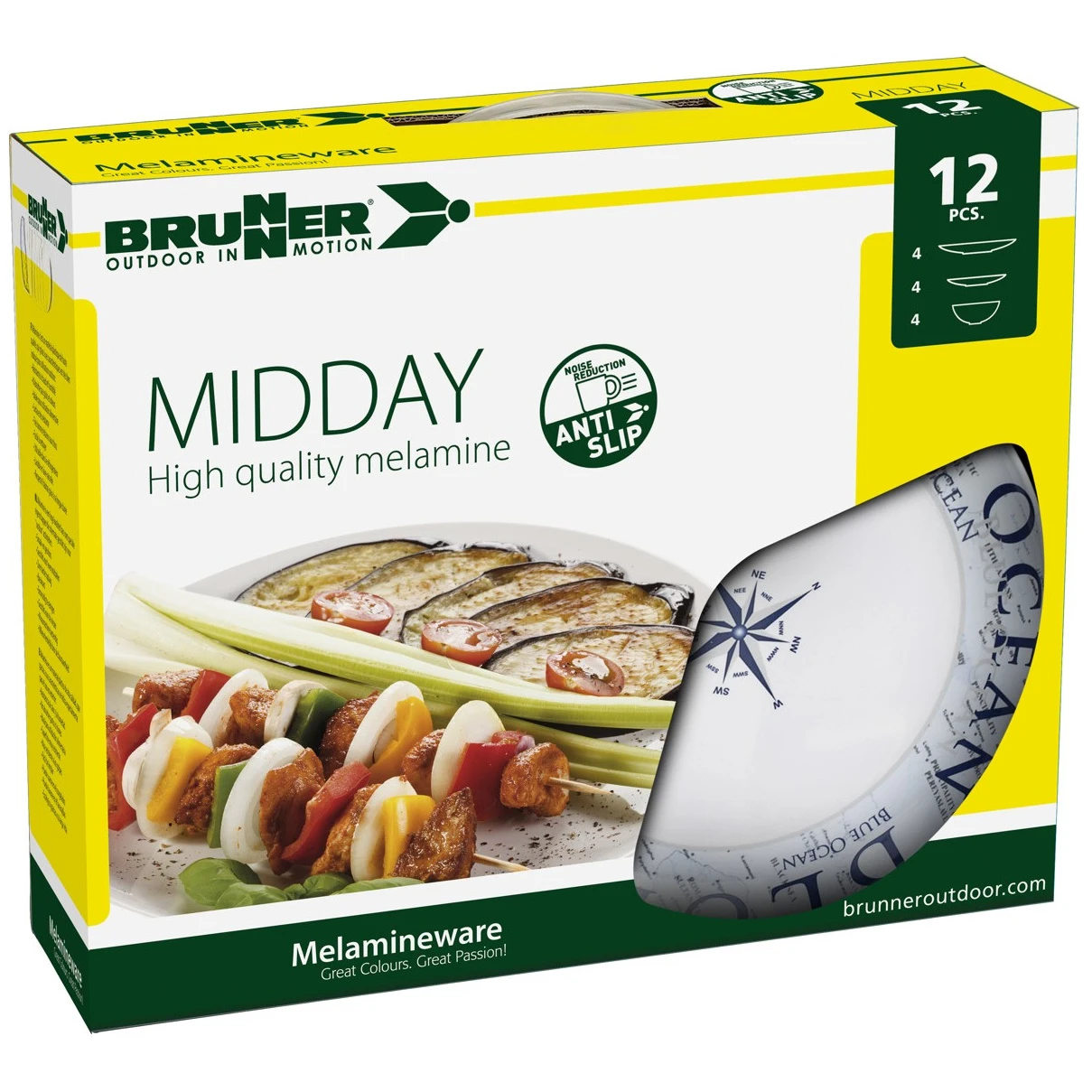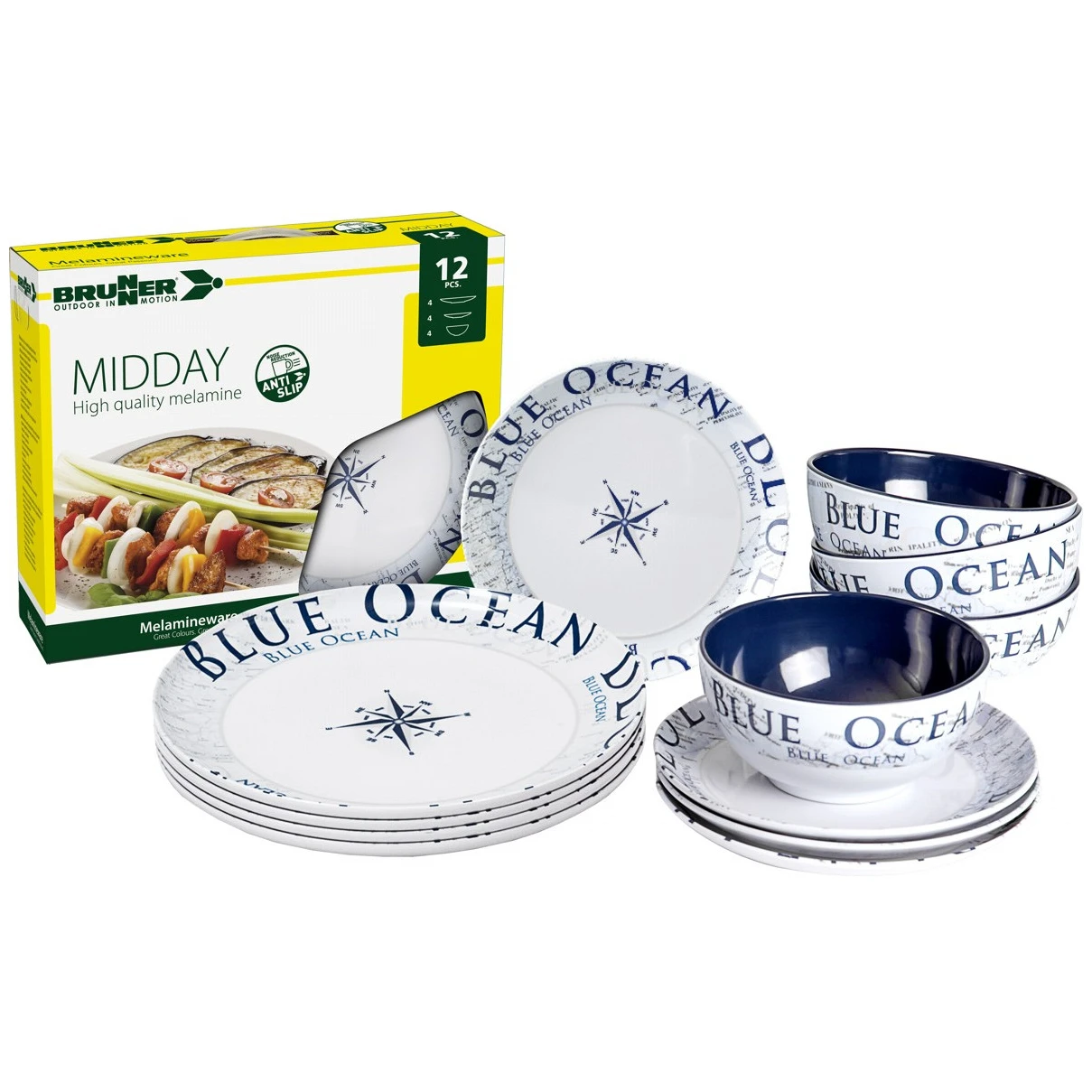 Set posuđa Podnevni Plavi Ocean marke Brunner sadrži osnovnu opremu za kampiranje. Set se sastoji od 12 posuda i namijenjen je za 4 osobe. U kampu ćete sigurno cijeniti povećanu izdržljivost zahvaljujući melaminu . Ovaj materijal je otporan na udarce, lako se čisti, otporan je na toplinu i vlagu, bez mirisa i okusa te je ekološki prihvatljiv. Posuđe se može staviti u zamrzivač kao i u perilicu posuđa.