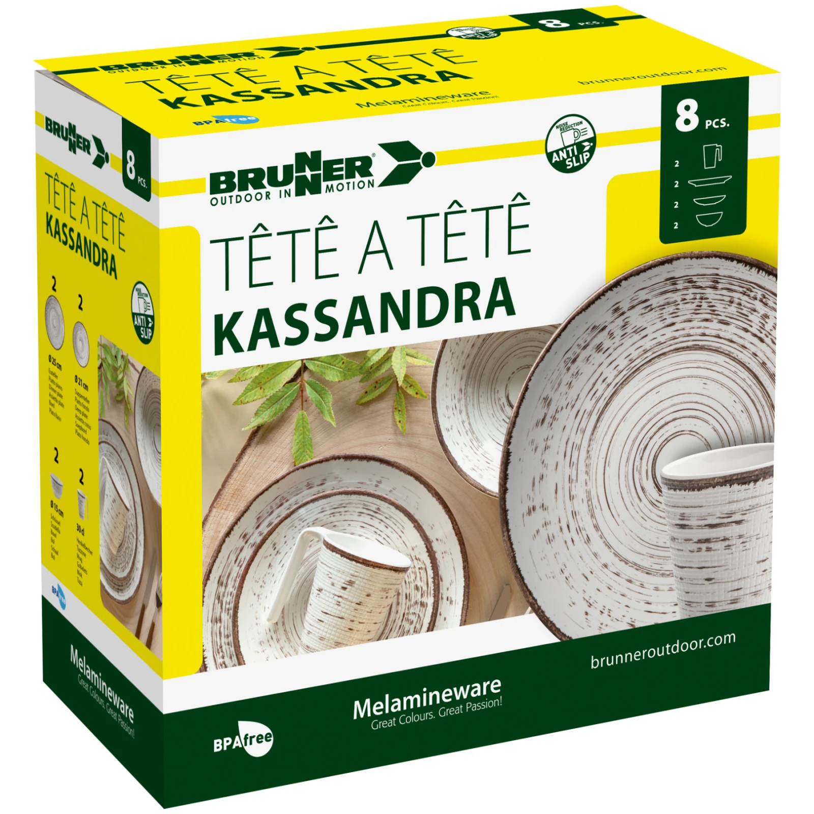 Kassandra tête-à-tête set je elegantan set posuđa od melamina za dvije osobe. Lagan i izdržljiv dizajn s protukliznom završnom obradom idealan je za kampiranje, putovanja i objedovanje na otvorenom.