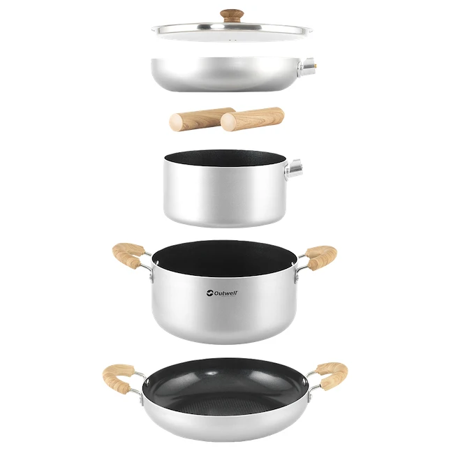 Outwell Feast Ceramic Set XL set za kampiranje savršeno staje u ruksak i u kamper. Slaže se u kompaktan paket i može nesmetano prelaziti s otvorenog plamena na indukciju.
