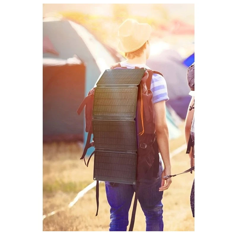 Panel je opremljen vodootpornim poliesterskim kućištem, ušicama za jednostavno pričvršćivanje (ruksak, bicikl, šator) i funkcijom automatskog pokretanja punjenja nakon spajanja uređaja. Tri USB priključka omogućuju punjenje većine uređaja, uključujući Apple, Samsung, Huawei, Xiaomi i druge.
