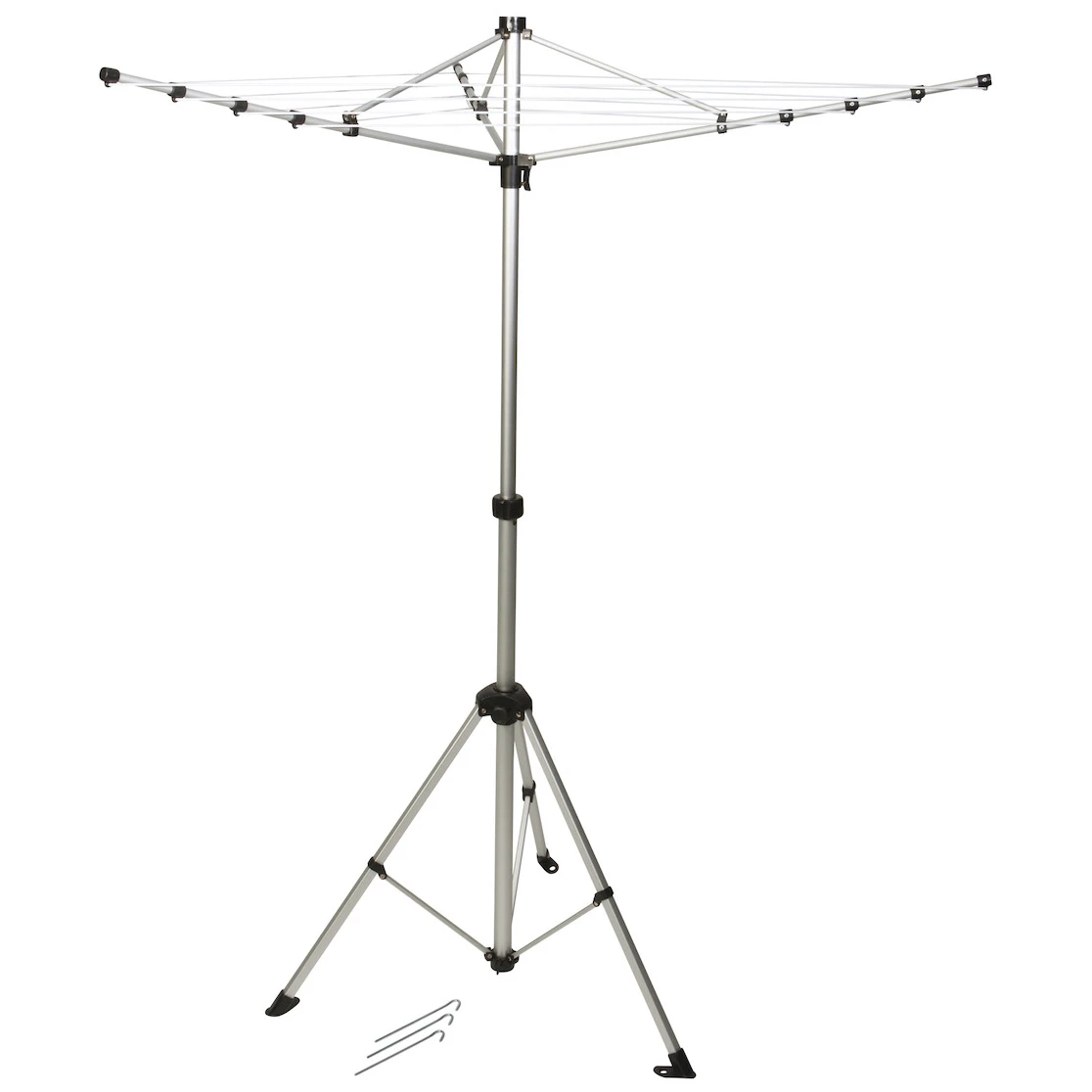 Ovaj sklopivi stalak za rublje dizajniran je tako da zauzima minimalan prostor, a istovremeno pruža dovoljno prostora za sušenje. Nudi ukupnu duljinu užadi od 12 metara i stoji na čvrstoj bazi. Lako se sklapa u vrlo kompaktnu veličinu i bez problema ga možete pohraniti u priloženu transportnu vrećicu. Za sigurno učvršćivanje u slučaju vjetra, uključena su i tri klina.