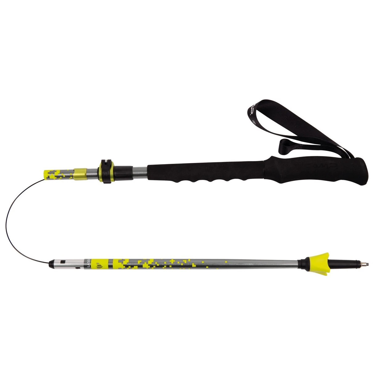 Sklopivi aluminijski treking štapovi Laser Adj marke Camp dizajnirani su za najzahtjevnije ture koje zahtijevaju preciznu kombinaciju lakoće, performansi i pouzdanosti. Konopac od nehrđajućeg čelika presvučen poliamidom i oblikovani spojevi segmenata olakšavaju i ubrzavaju montažu. Gornji segment opremljen je brzim i sigurnim sustavom zaključavanja za podešavanje od 115 do 135 cm. Dvostruko produžene ergonomske ručke od pjene dizajnirane su za dobro prianjanje u bilo kojem položaju, a ergonomske trake za zapešće izrađene su od mekog materijala za izvrsnu udobnost. Vrhovi od karbida za najbolje prianjanje i izdržljivost.