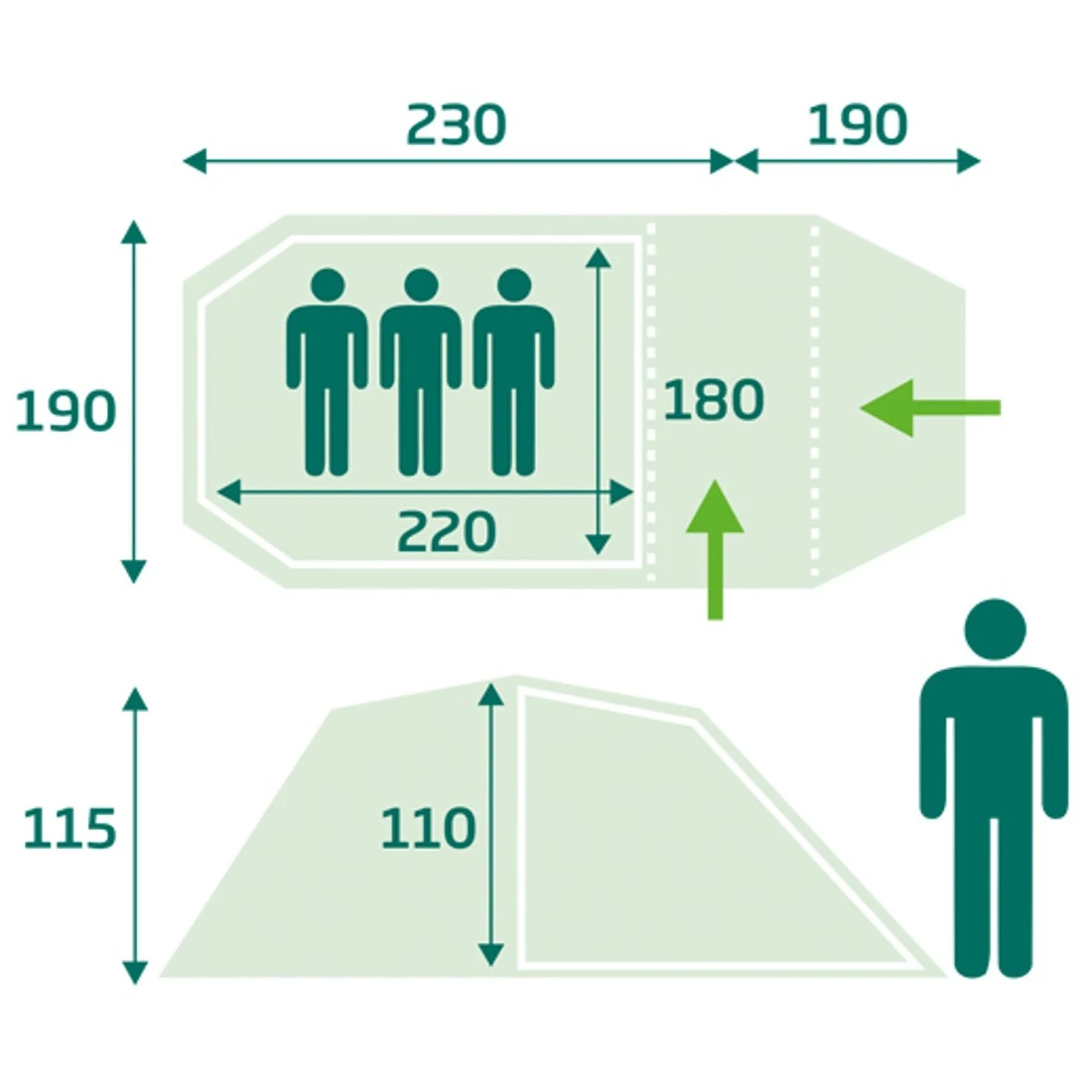 Označava za koliko je osoba šator/viseća mreža namijenjena. Za šatore, prtljaga i ostala oprema nisu uzeta u obzir. Stoga pripazite na broj predvorja ili apsida ili odaberite nešto prostraniji šator za prtljažni prostor. Viseće mreže proizvode se u veličinama za jednu osobu (1 osoba) ili dvostruku (2 osobe). Razlike između njih su u nosivosti i dimenzijama.