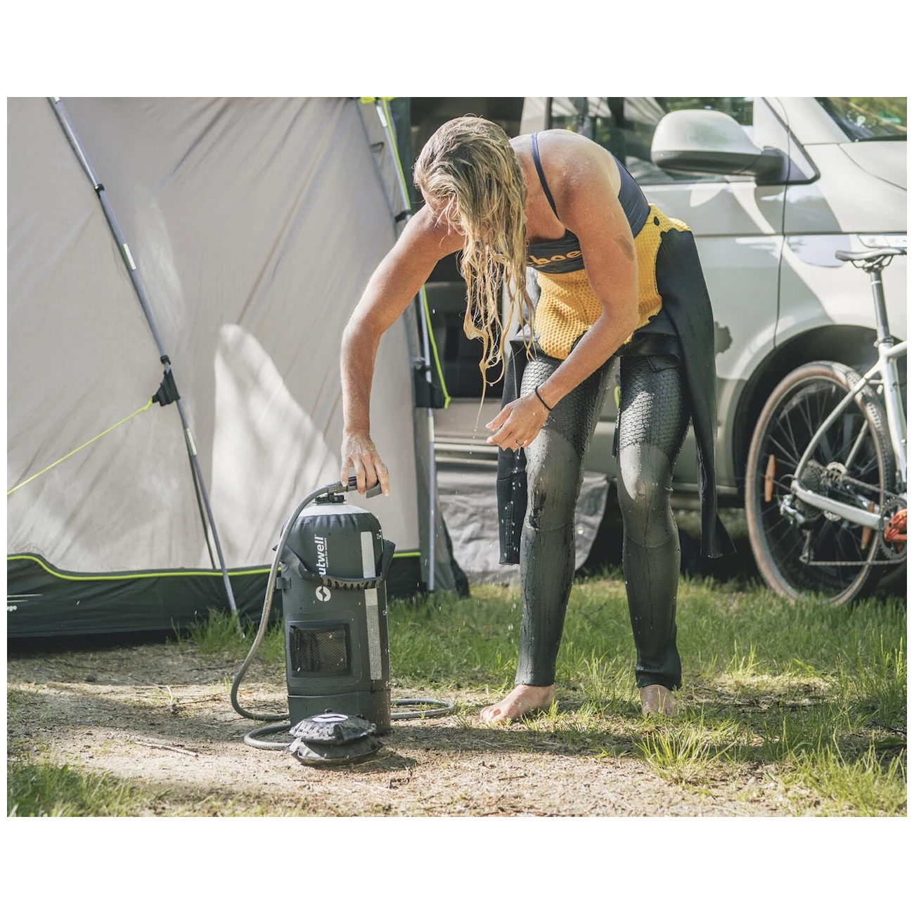Ručni kamperski tuš Outwell Seabreeze Pressure Shower pogodan je za upotrebu u vrtu, kampu ili na putovanjima. Možete se istuširati, oprati psa ili isprati neopren ili kamp opremu.