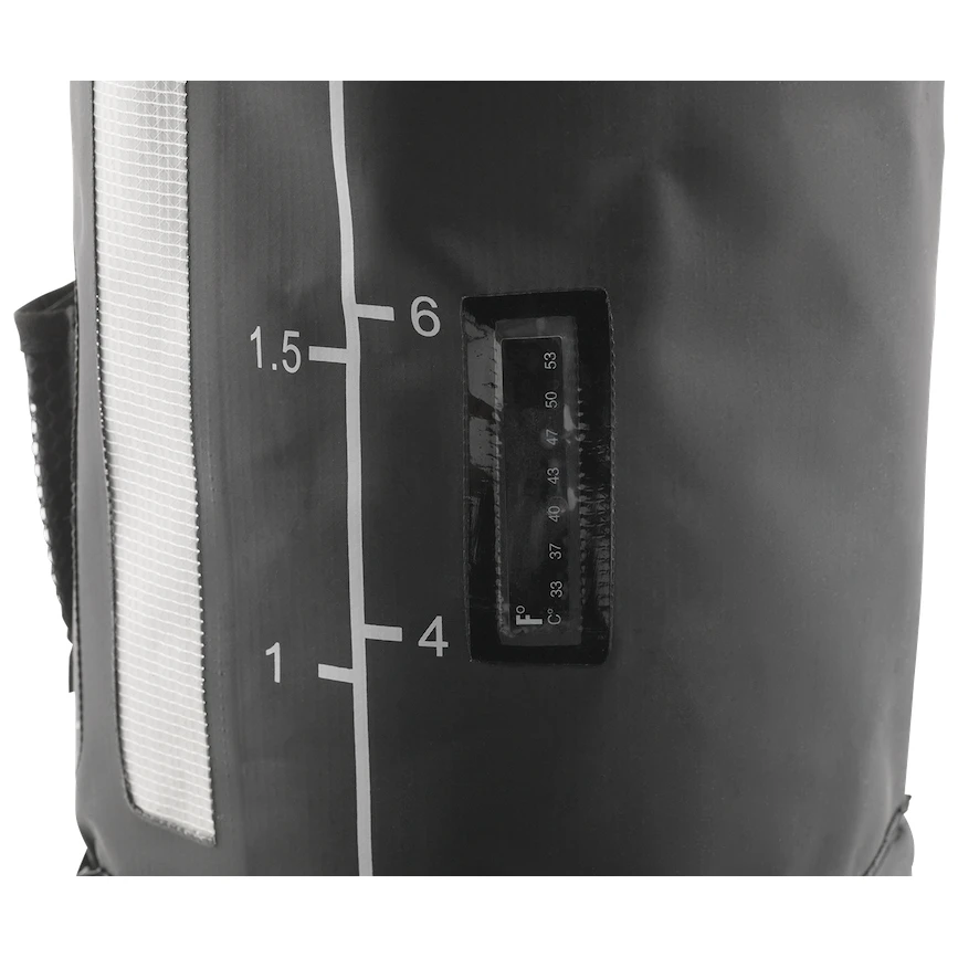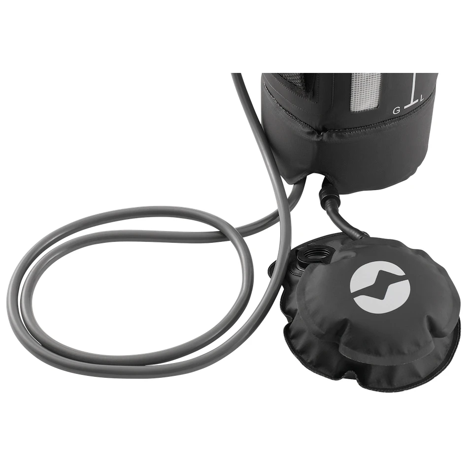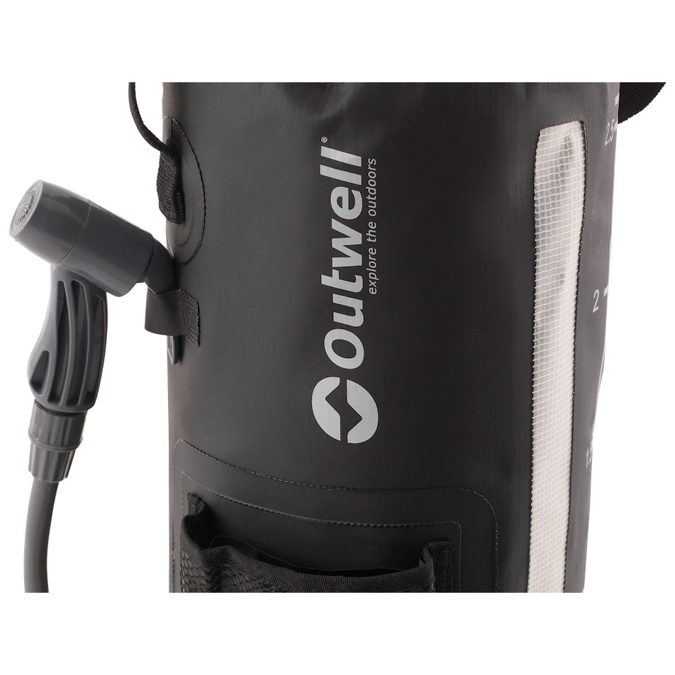 Tuš je izrađen od izdržljivog PVC-a crne boje, tako da se voda unutra ugodno zagrijava na suncu. Kada tuš ne trebate, zahvaljujući mekom materijalu lako ga možete sklopiti i spremiti u ruksak. Na vanjskoj strani nalazi se termometar s ljestvicom od 33°C do 53°C, zahvaljujući kojem ćete uvijek imati pregled temperature vode i prozirni mjerač razine vode. Prenošenje i vješanje je jednostavnije zahvaljujući čvrstoj ručici. Pumpanje vode je ručno, pomoću ručne pumpe. Voda zatim teče crijevom do tuša, koji se može zaključati za slučaj da se trebate otuširati bez upotrebe ruku.