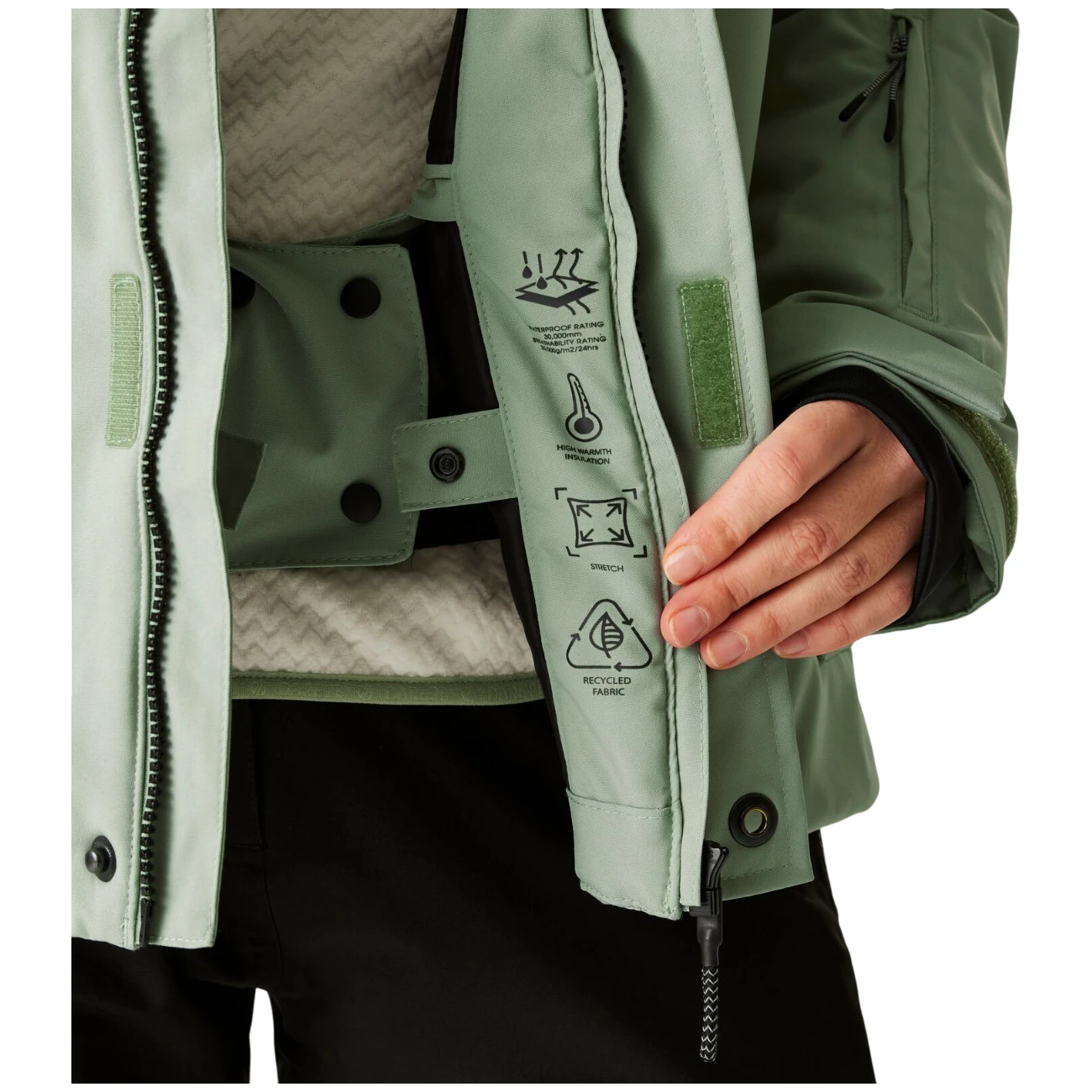 Visoko toplo punjenje i mekana stražnja ploča podstave održavaju tijelo toplim. Tehnička kapuljača s podesivim regulacijama, patentni zatvarač s preklopom protiv vjetra, tople unutarnje manžete rukava i snježni pojas s gel držačem pružaju potpunu zaštitu i praktičnost.
