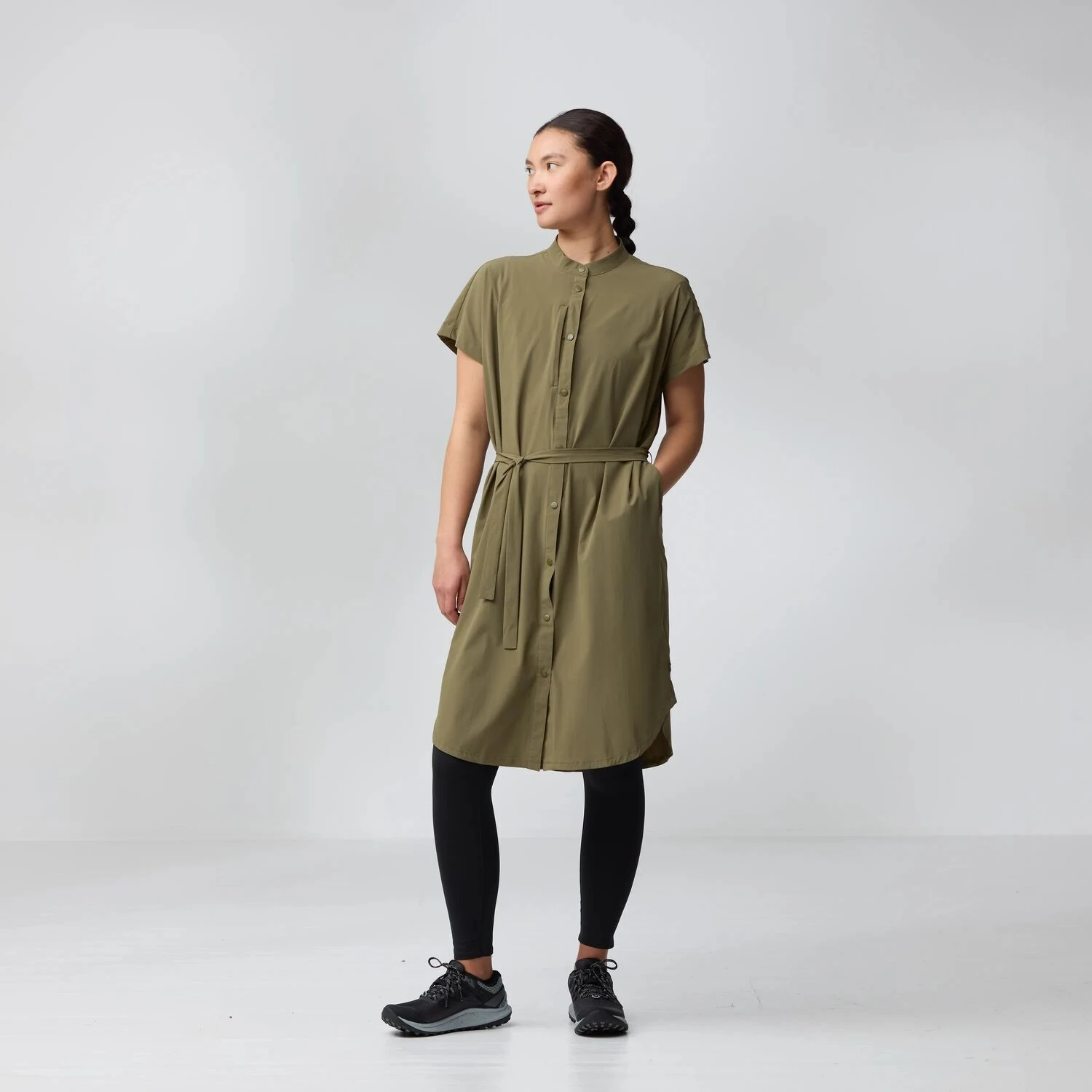 Labaviji kroj s blago zakrivljenim rubom iznad koljena podržava cirkulaciju zraka i doprinosi cjelodnevnoj udobnosti. Odvojivi remen omogućuje jednostavno prilagođavanje siluete prema potrebi. Zbog male težine i kompaktnosti, haljina je savršen izbor za putovanja i višednevne ekspedicije.
