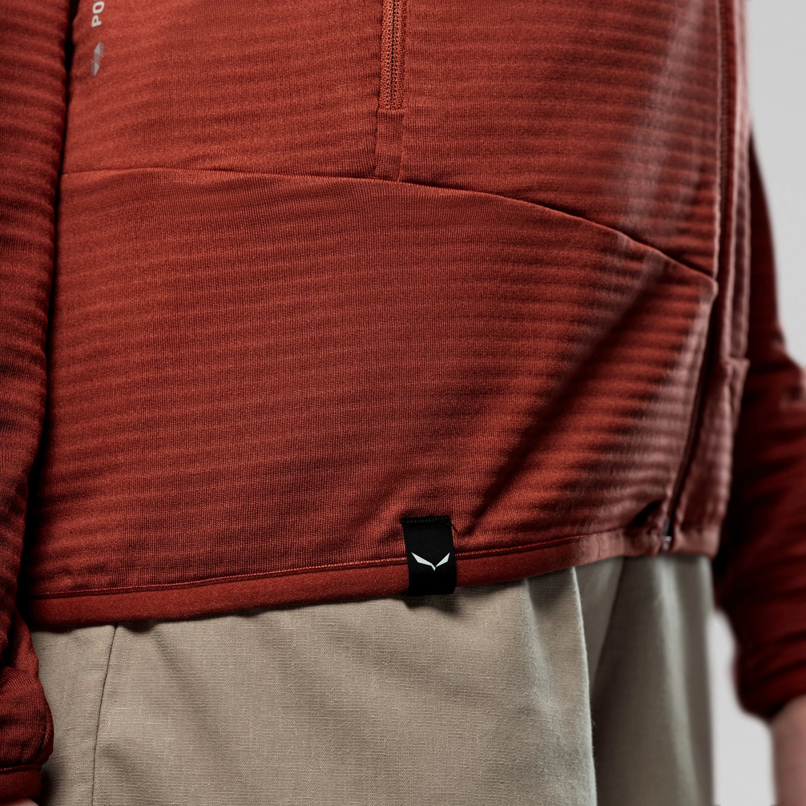 Sintetički Polarlite Stripes flis gramaže 255 g/m² pruža učinkovitu izolaciju i brzo odvođenje vlage. Vanjska strana ima karakterističnu prugastu strukturu, dok unutarnja brušena vlakna zadržavaju zrak i pomažu održati tjelesnu toplinu. Materijal sadrži 70 % recikliranih vlakana i proizvod nosi oznaku Salewa Committed.