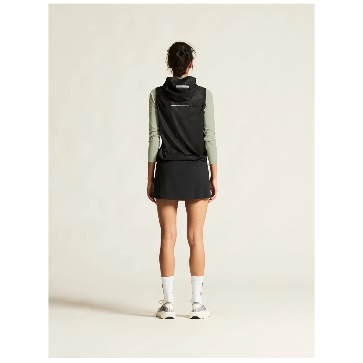 Vrlo lagani rastezljivi materijal od recikliranog poliestera nudi izvrsnu prozračnost i učinkovitu ventilaciju, koju podržava perforacija po cijeloj površini suknje. Unutarnje elastične kratke hlače pomažu u odvođenju vlage i osiguravaju udobnost čak i tijekom duljeg kretanja.