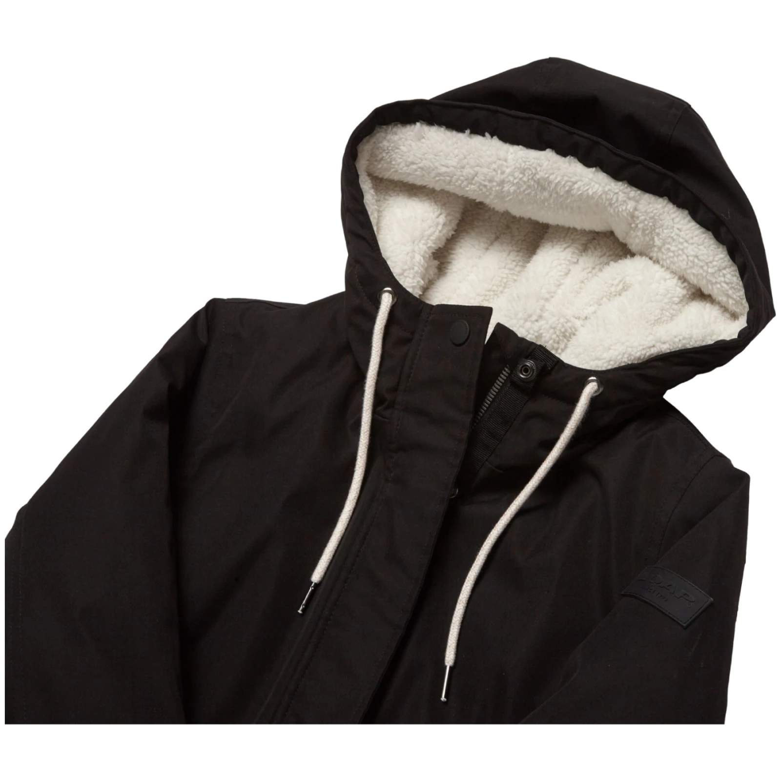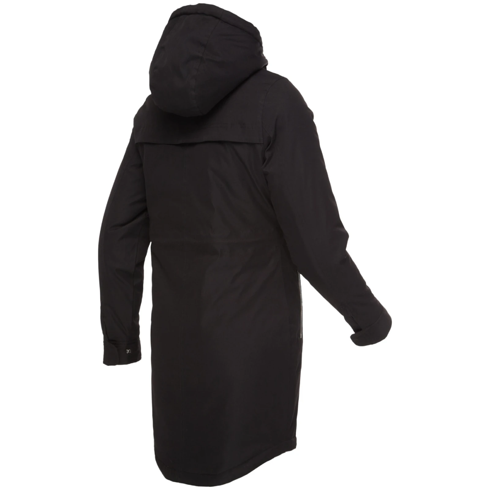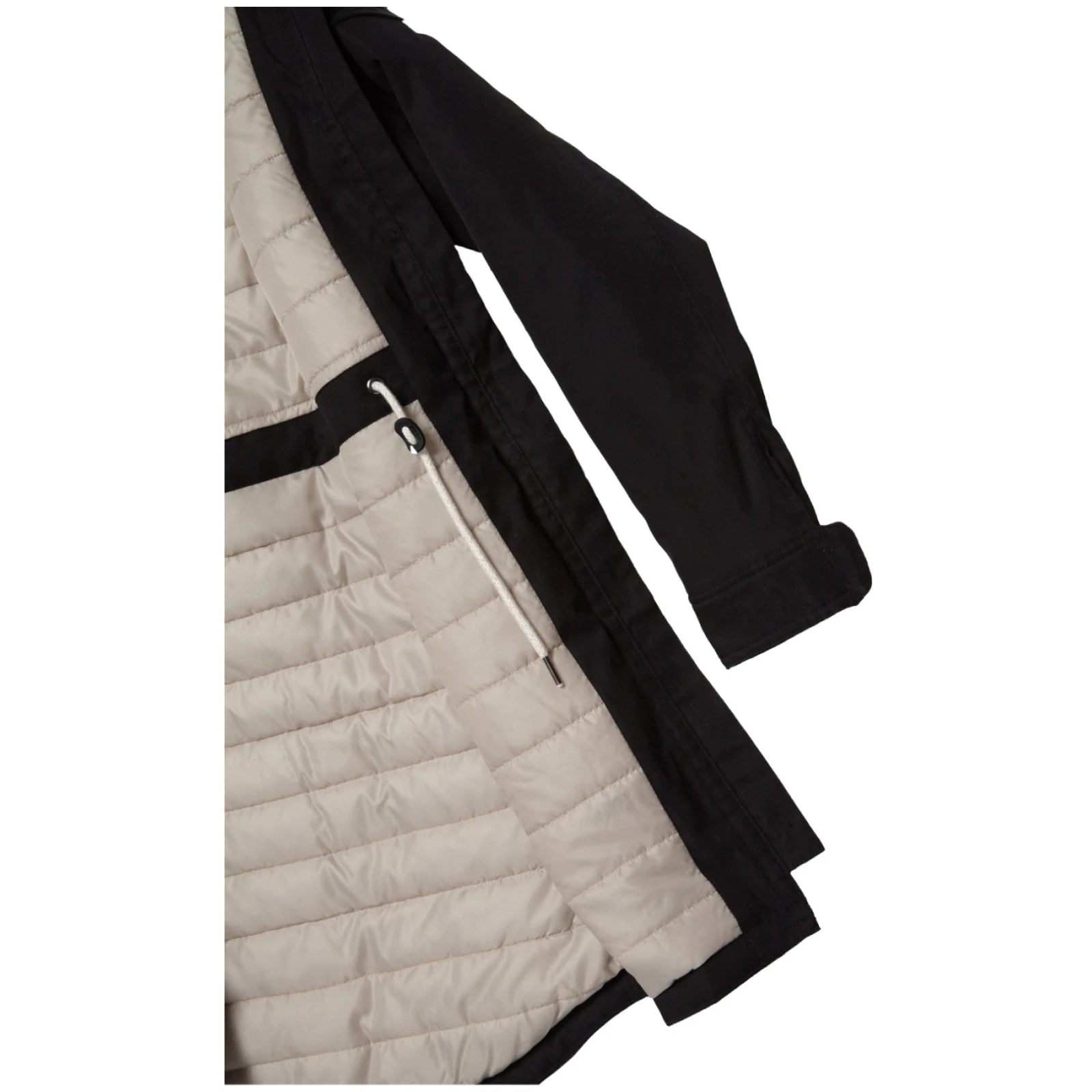 Kaput je dizajniran u klasičnom kroju s mogućnošću stezanja u struku vezicom i ima podesivu fiksnu kapuljaču. Rukavi imaju kopče, a donji rub je bez vezice. Dvosmjerni patentni zatvarač od kosti s metalik efektom ne samo da pridonosi atraktivnosti, već omogućuje i otvaranje s obje strane. Dva praktična džepa s patentnim zatvaračem služe za spremanje sitnica.